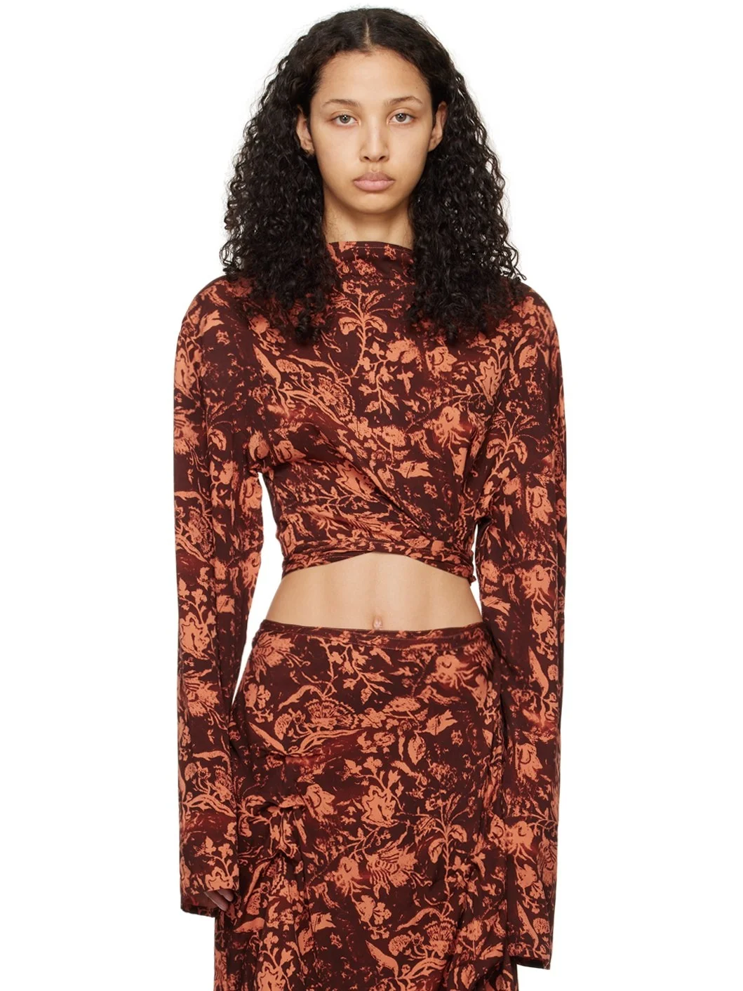 Viscose twill T-shirt. Floral pattern printed throughout. · Crewneck · Self-tie straps at cropped hem Supplier color: Brown/Orange 100% viscose. Made in Turkey 241772F110003