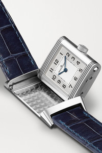 EDITORS'NOTES Jaeger-LeCoultre's 'Reverso' timepiece was first released in the '30s - the label's maintained its Art Deco appeal by keeping the sleek lines and delicate features of the original styles. This small 'Classic' reference is crafted from polished stainless steel and has a signature reversible case that can be worn with the silvered dial on display or smooth back covering it. The tactile blue alligator strap feels equally timeless and elegant. All Jaeger-LeCoultre watches still within the initial 2-year warranty period under the original International Limited Warranty will be eligible to benefit from a 6-year extension, for a total of 8 years warranty. SIZE & FIT This item's measurements are: - Circumference: 19cm / 7.5in DETAILS & CARE - Movement - Swiss-made 657 calibre quartz movement - 4 jewels Functions - Hour and minute hands Dial - Silvered dial - Blue steel hour and minute bâton hands, black Arabic numerals and markers Case - Stainless steel case - Crown for time adjustments - Sapphire glass crystal - Stainless steel case back - Buckle-fastening blue alligator strap Specifications - Case diameter: 21mm; case length: 35.78mm - Water resistance: 3 bar - Comes in a presentation box - Alligator: USA - Reference number: 2618540 - Manufactured in Switzerland