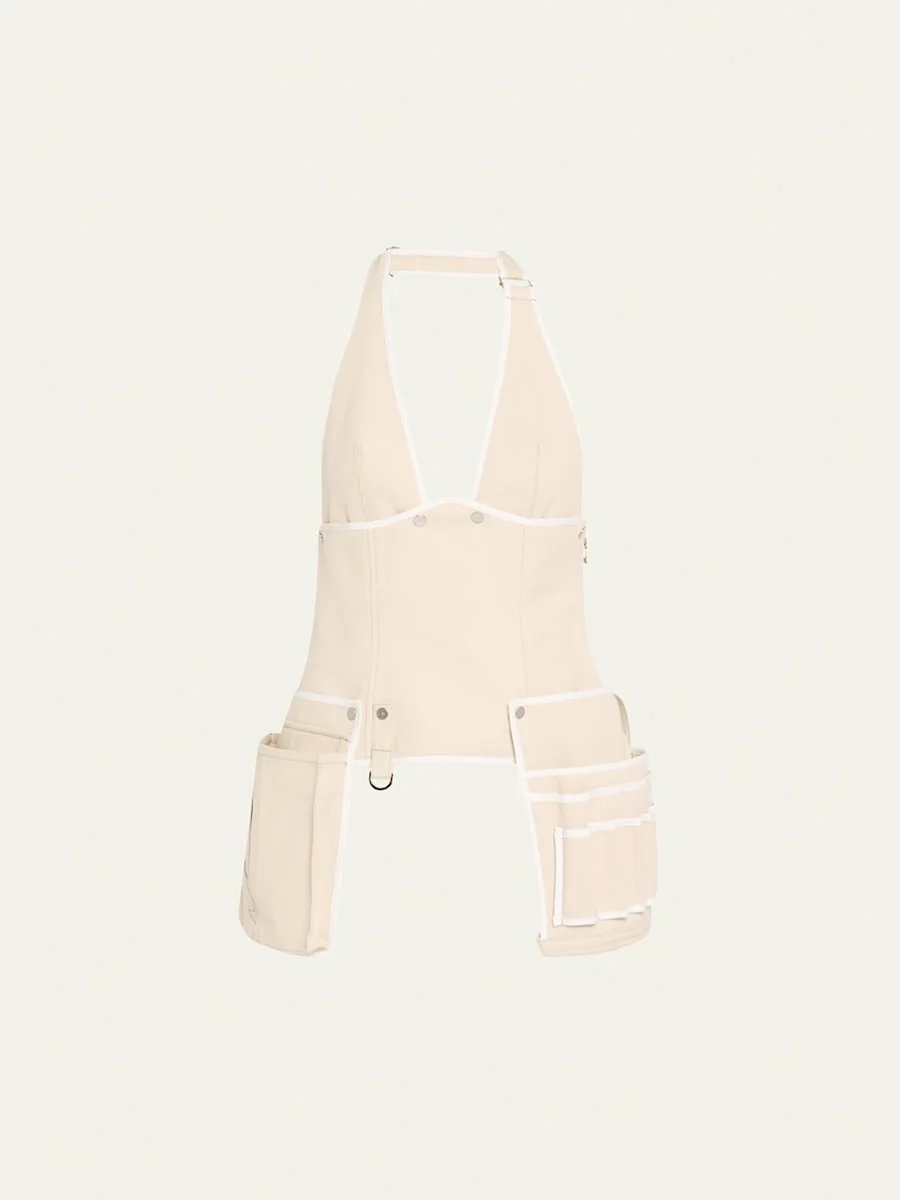 Jane Wade toolbelt-inspired bustier top finished with contrast piping Adjustable halter neckline Sleeveless Side pockets Slim fit Hem sits at the hip Exposed side zip Cotton Dry clean Made in USA Online Inquiries: BGS21_T6H4L| Store Inquiries: #4983280
