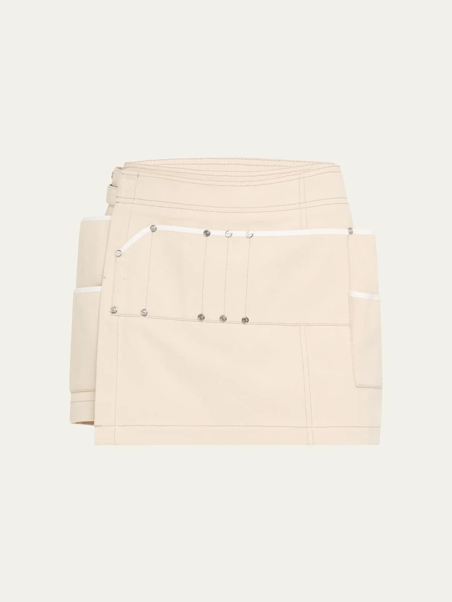 Jane Wade toolbelt-inspired mini skirt finished with contrast piping Mid-rise; sits high on the hip Flap and slip pockets Skirt falls straight from hip to hem Hem falls above the knee Side wrap closure with snaps Cotton Dry clean Made in USA Online Inquiries: BGS21_T6H4M| Store Inquiries: #4983281