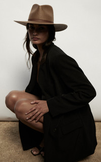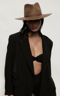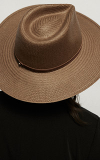 Janessa Leone prioritizes thoughtful functionality, high-quality materials, and handcrafted construction. The Southern California native only works with vendors and factories that share her consciously considered values, ensuring supply chain transparency, ethical work environments, and environmental accountability from every partner who touches their designs. This classic fedora style is made with woven, packable straw into a structured modern shape. It's detailed with a tonal leather band to create a minimal and timeless look. PRODUCT DETAILS - This item is not eligible for expedited shipping - Due to the handwoven pattern and the natural dye, each hat is considered one of a kind - UPF 45+ - Composition: Endura straw, leather band - Made in the USA SIZE & FIT - Runs true to size. If between sizes, we suggest sizing up. - Brim: 3.5" - Crown: 3.75" - Leather Band: 0.5"