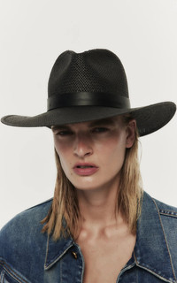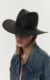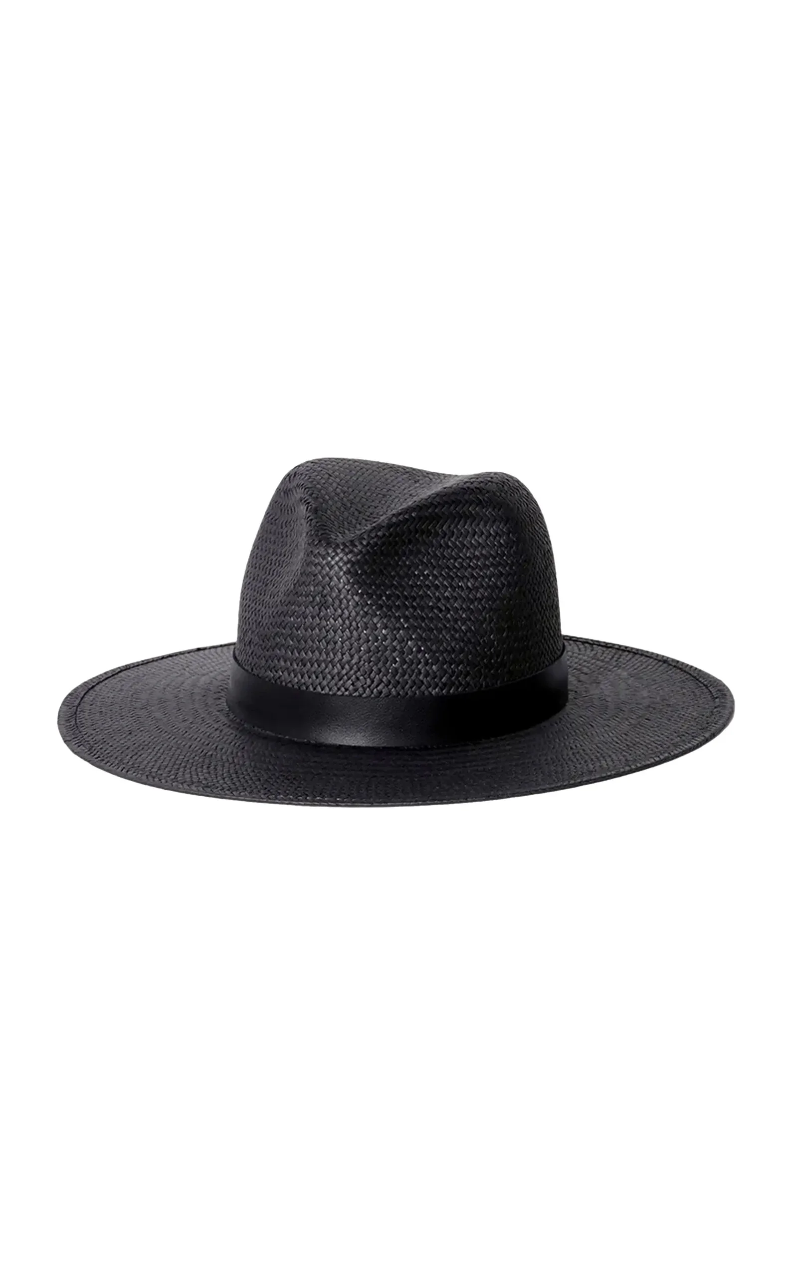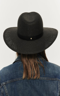 Each Janessa Leone accessory is expertly hand-crafted in Los Angeles with responsibly-sourced materials and ethical practice—prioritizing people and planet above all. Simone is a classic style fedora made with packable straw and a structured modern shape. Rich black straw with a tonal leather band creates a minimal and timeless look. This hat was made to accompany you to the beach, under the sun, to dinner, and anywhere you travel in between. PRODUCT DETAILS - This item is not eligible for expedited shipping - Slip on - UPF 45+ - Composition: Endura straw, leather band - Made in the USA SIZE & FIT - Brim: 3.5" - Crown: 4" - Band 1"