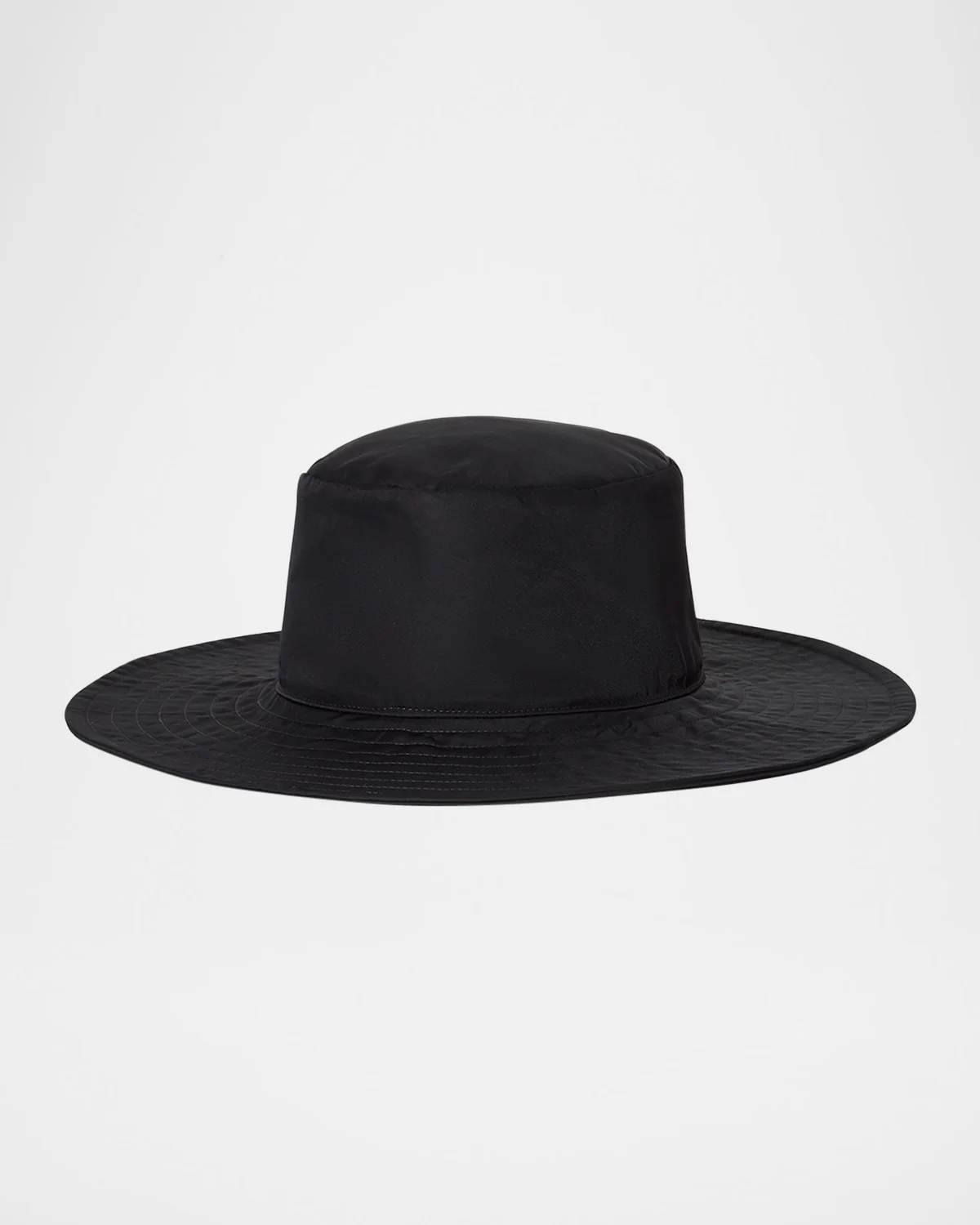 - Janessa Leone "Shiloh" rain bucket hat in nylon and organic cotton - Approx. 3.5"H - Round crown - Structured brim with self-tie straps - Item Weight (Lbs.): 2.5 - Spot clean - Made in USA