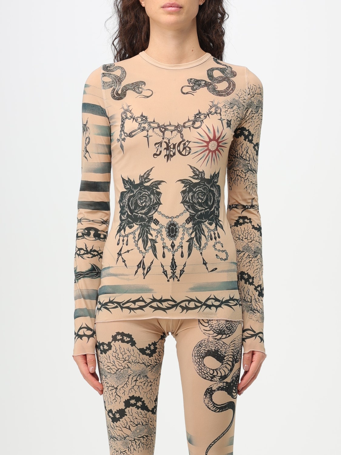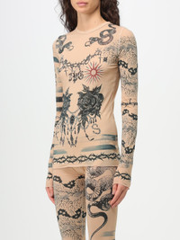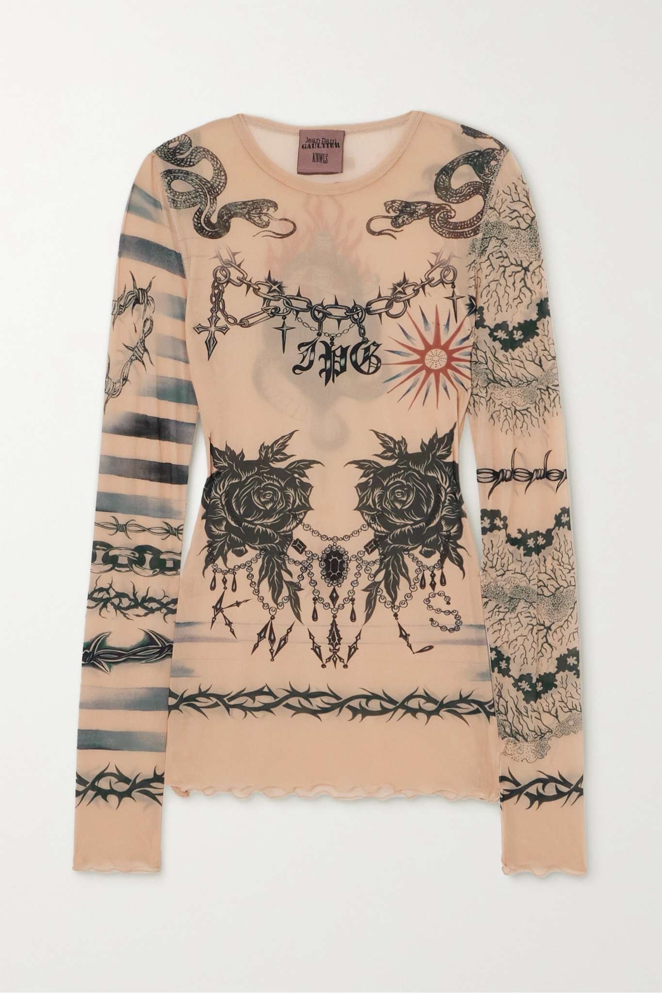 EDITORS'NOTES When Alexandre Arsenault and Charlotte Knowles of KNWLS came to collaborate with Jean Paul Gaultier, there was just one starting point for patterns - the latter's tattoo-inspired motifs from 2009. Made from stretch-jersey for a second-skin fit, this top is inked with roses, serpents, barbed wire and nautical stripes. The lettuce hem can easily be tucked into skirts or jeans. SIZE & FIT - Fits true to size, take your normal size - Designed for a close fit - Lightweight, stretchy fabric - Model is 175cm/ 5'9" and is wearing a size Small DETAILS & CARE - Multicolored stretch-jersey - Slips on - 90% polyamide, 10% elastane