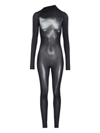 asymmetric-collar mesh jumpsuit Highlights - Black - Mesh - Asymmetric collar - Long sleeves - Close-fitting Made in Italy Composition Polyamide 100% Washing instructions Read Manufacturer Guidelines