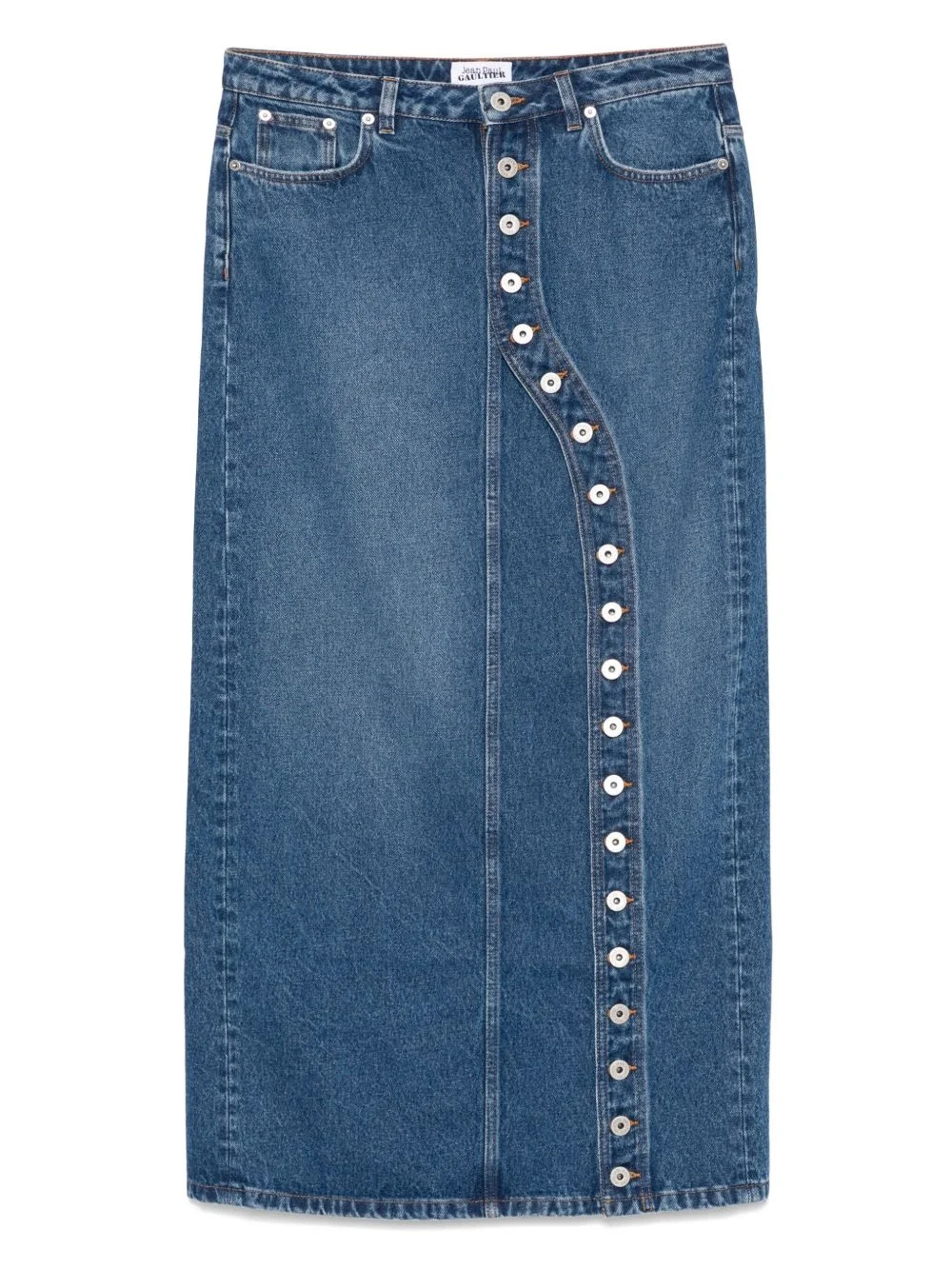 asymmetric denim midi skirt Highlights - Indigo blue - Front button fastening - Classic five pockets - Belt loops - Logo patch to the rear Made in Italy Composition Outer: Cotton 100% Lining: Polyester 65%, Cotton 35%