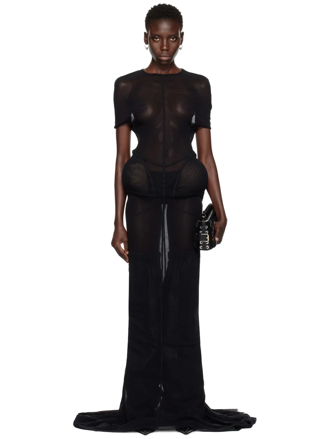 Sheer nylon mesh dress. · Round neck · Padded cups at waist · Extended hem · Cap sleeves · Locker loop at back collar Part of the Jean Paul Gaultier x Shayne Oliver collaboration. Supplier color: Black 100% polyamide. Made in France 242808F055025