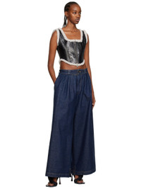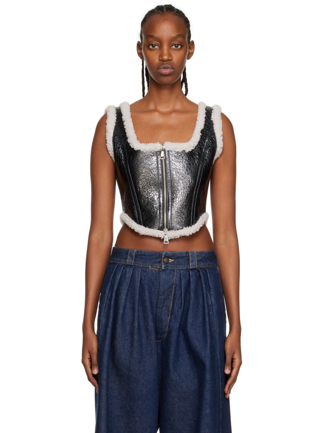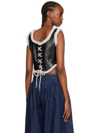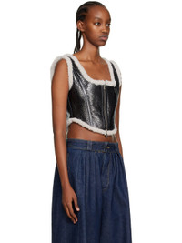 Paneled laminated grained sheepskin corset-style tank top. Shearling trim throughout. · Scoop neck · Two-way zip closure at front · Curved hem · Lace-up detailing at back · Full shearling lining Supplier color: Black/Ecru 100% sheepskin.