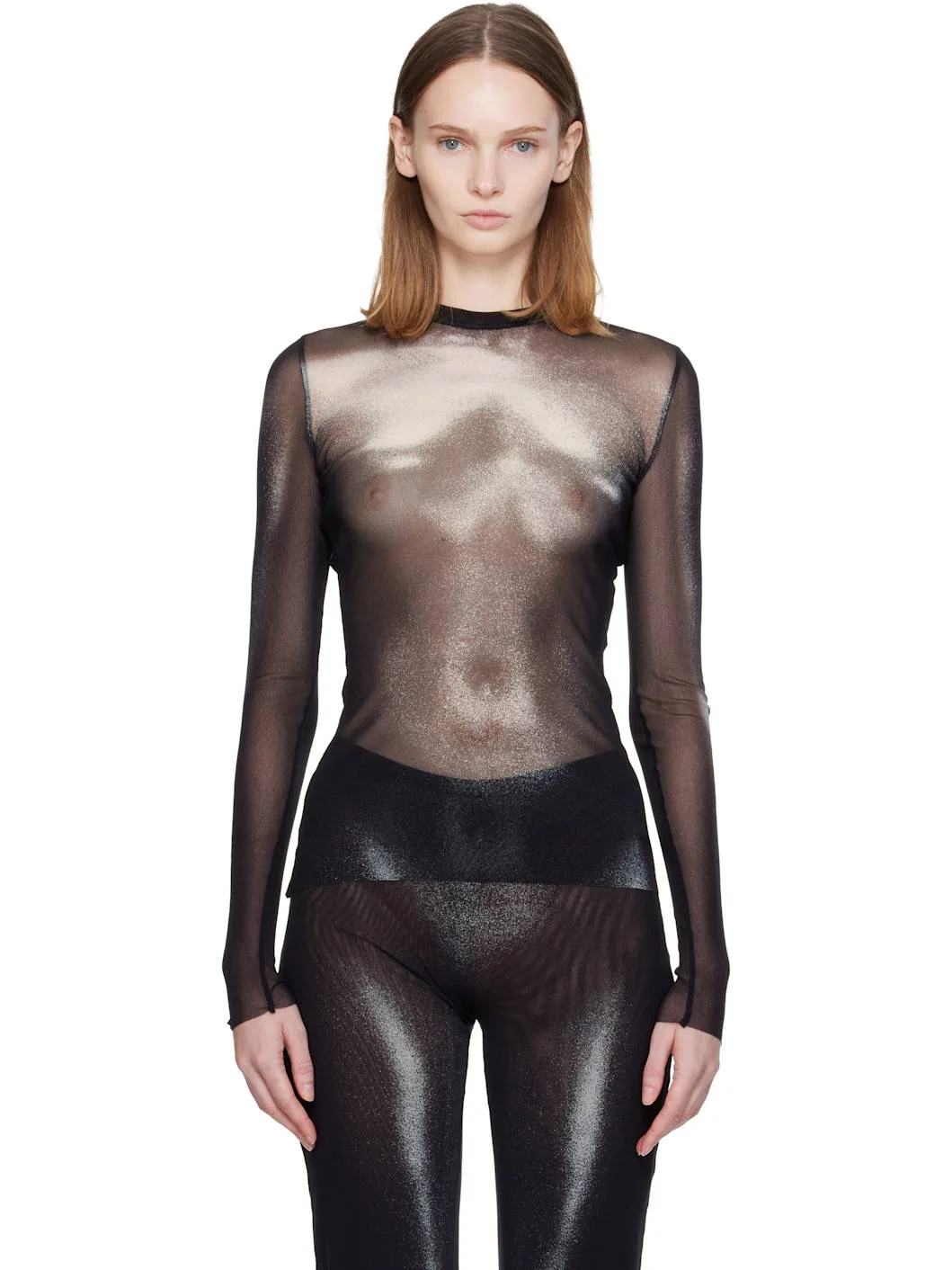 Semi-sheer nylon tulle top. · Trompe l'œil graphic printed throughout · Slim-fit · Crewneck · Raw edge at hem and cuffs · Locker loop at back collar Supplier color: Black/Silver 100% polyamide. Made in Italy 252808F110016