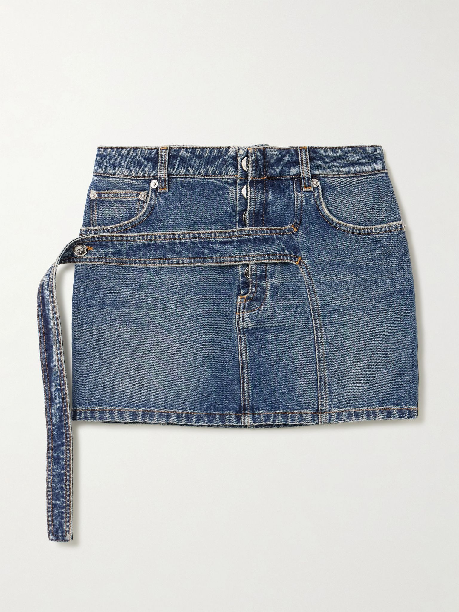 Jean Paul Gaultier's mini skirt features an elongated strap at the front – a detail seen throughout the label's Fall '25 collection. It's made from denim that's faded and whiskered for an authentic vintage feel and traced with contrast topstitching. Complement the low-rise fit with a cropped tee. Size & Fit - Fits true to size, take your normal size - Mini-length, designed to be worn just below the natural waist - Mid-weight, non-stretchy denim - Model is 177cm/ 5'11" and is wearing a FR 36 Model measurements: - Bust: 80cm/ 31.5" - Waist: 65cm/ 25.5" - Hip: 89cm/ 35" Details & Care - Blue denim - Button fastenings along front - 100% cotton; pocket lining: 65% polyester, 35% cotton - Machine wash