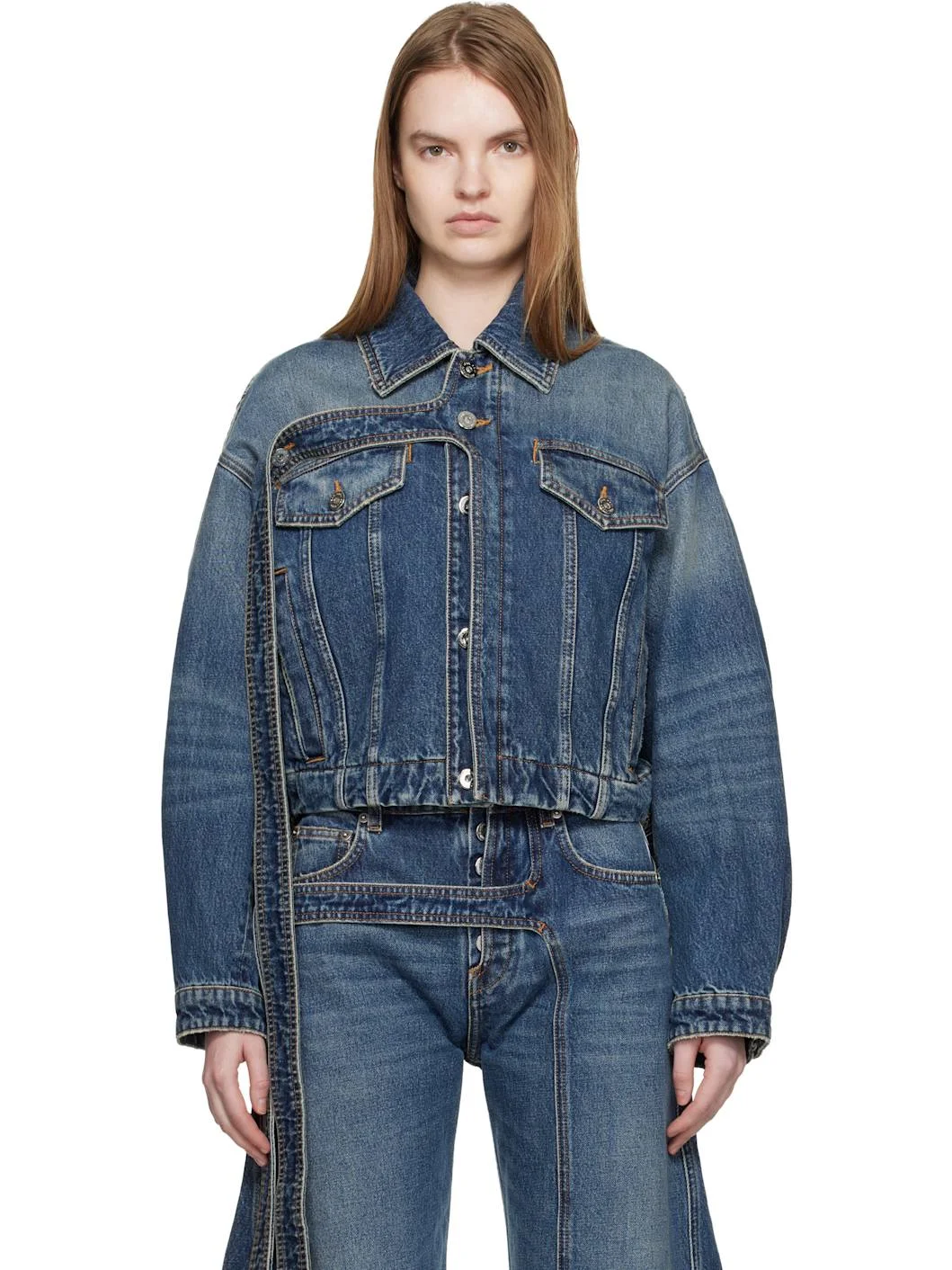 Non-stretch denim jacket. · Fading and whiskering throughout · Spread collar · Button closure · Flap pockets at chest · Button strap and welt pockets at front · Buttoned barrel cuffs · Logo patch and adjustable button tabs at back hem · Locker loop at back · Contrast stitching in tan Supplier color: Vintage blue Body: 100% cotton. Trim: 65% polyester, 35% cotton. Made in Italy 252808F060002