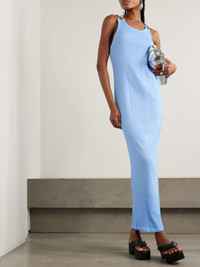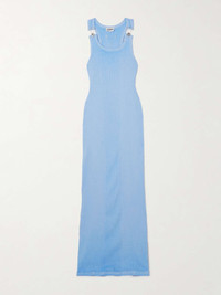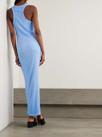 EDITORS'NOTES Collecting Jean Paul Gaultier dresses is a lot like collecting art – each piece is truly special and speaks to the designer's oeuvre. Mirroring denim overalls, this maxi dress is fitted with a silver-tone clip on each strap. It's cut from ribbed cotton-jersey to skim the figure and has a racer-back. SIZE & FIT Model measurements: - Fits true to size, take your normal size - Designed for a slim fit - Mid-weight, slightly stretchy fabric - Model is 180cm/ 5'11" and is wearing a size XSmall - Bust: 80cm/ 31.5" - Waist: 65cm/ 25.5" - Hip: 89cm/ 35" DETAILS & CARE - Sky-blue melange cotton-jersey - Slips on - 100% cotton - Machine wash or dry clean - Designer color: Baby Blue