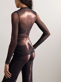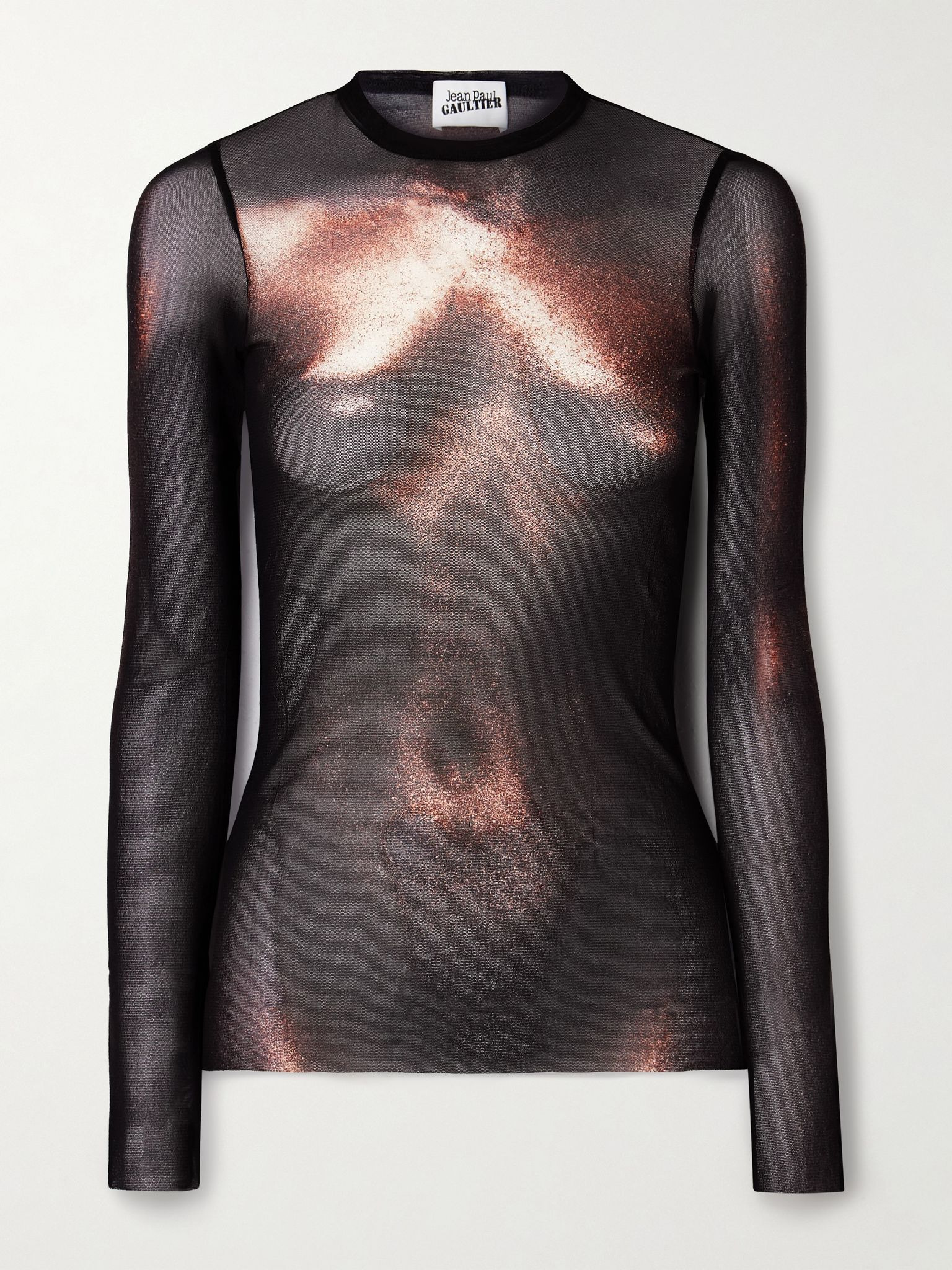 Jean Paul Gaultier champions the trompe l'œil effect so flawlessly, you're guaranteed to do a double take because it looks so realistic. Made from semi-sheer mesh, this top is printed with the 'Body Dust' motif. It's meant to be worn with the coordinating pants in our edit, and we carry the dress version, too. Size & Fit - Fits true to size, take your normal size - Designed for a close fit - Lightweight, semi-sheer, stretchy fabric - Model is 175cm/ 5'9" and is wearing a size Small Details & Care - Black, burgundy and white mesh - Slips on - 100% polyamide - Hand wash or dry clean