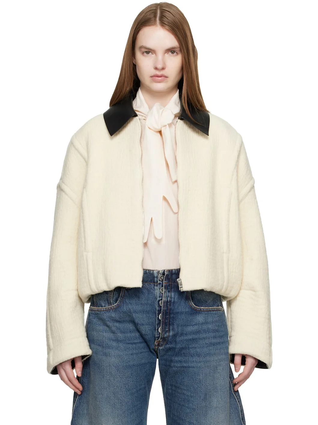 Stretch wool melton jacket. · Buffed lambskin spread collar · Zip closure · Seam pockets · Elasticized hem · Locker loop at back · Full cotton poplin lining Supplier color: Ecru/Black Body: 99% wool, 1% elastane. Trim 1: 92% acetate, 8% polyester. Trim 2: 100% lambskin. Lining: 100% cotton. Made in Italy 252808F063000
