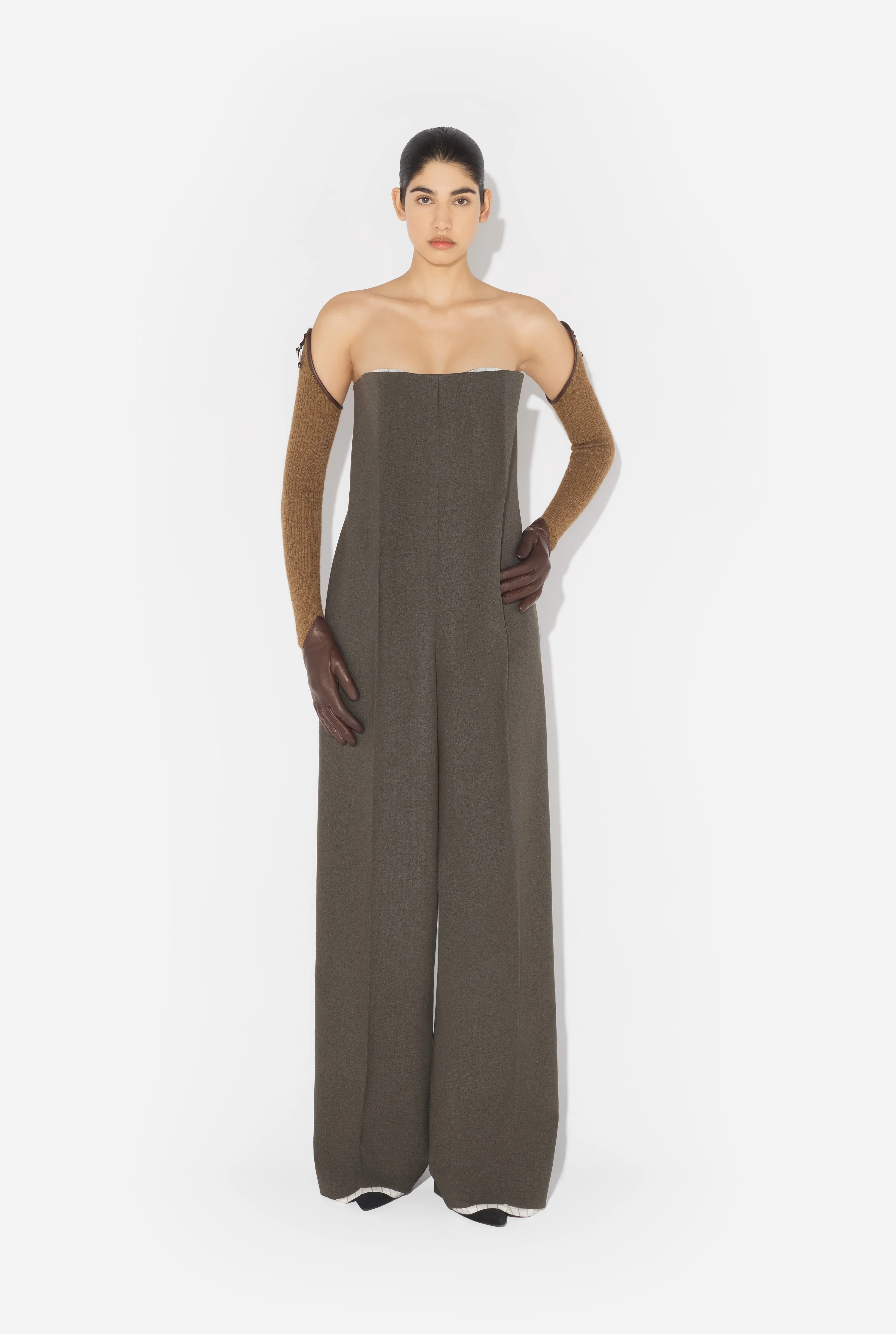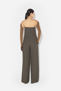 Suit bustier bodysuit in khaki virgin wool with pleat details and tennis-striped shirt finishes. PRODUCT DETAILS - Straight fit - Pleat details forming the bodysuit’s structure - Inner corset with boning - Shirt finishes on chest and lower part - Invisible zip fastening in back - Main materials: 88% virgin wool, 12% polyamide - Secondary materials: 78% viscose, 14% silk, 8% cotton - Made in France - 25/04-W-JS005-W037-41