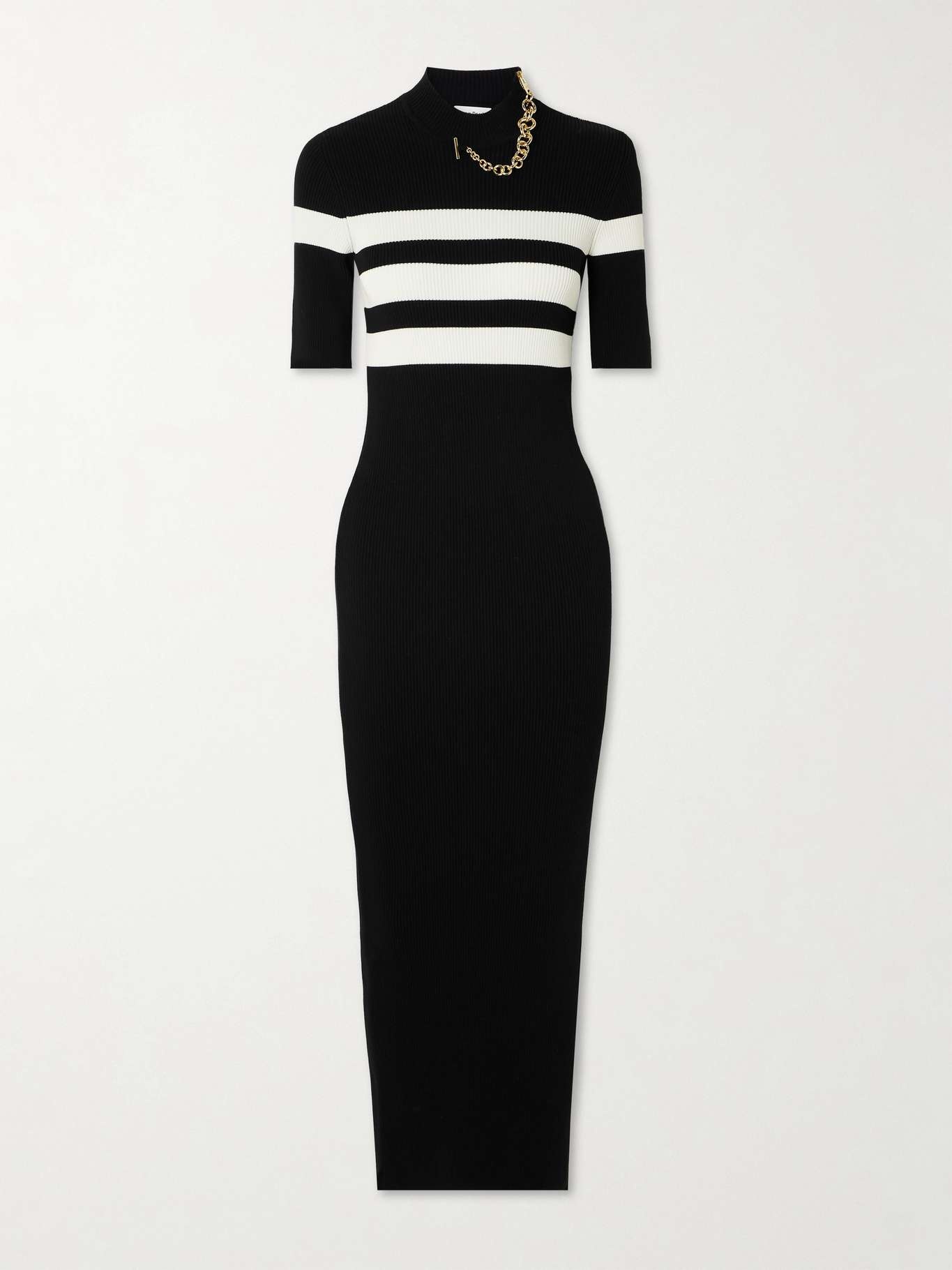 Chain-embellished striped ribbed-knit maxi dress Black