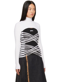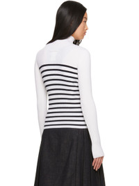 Rib knit stretch extrafine merino wool-blend turtleneck. Stripes throughout. · Criss-crossing straps at open front · Locker loop at back collar Part of the Tattoo collection. Supplier color: White/Navy 93% merino wool, 5% polyamide, 2% elastane. Made in Italy 241808F099010