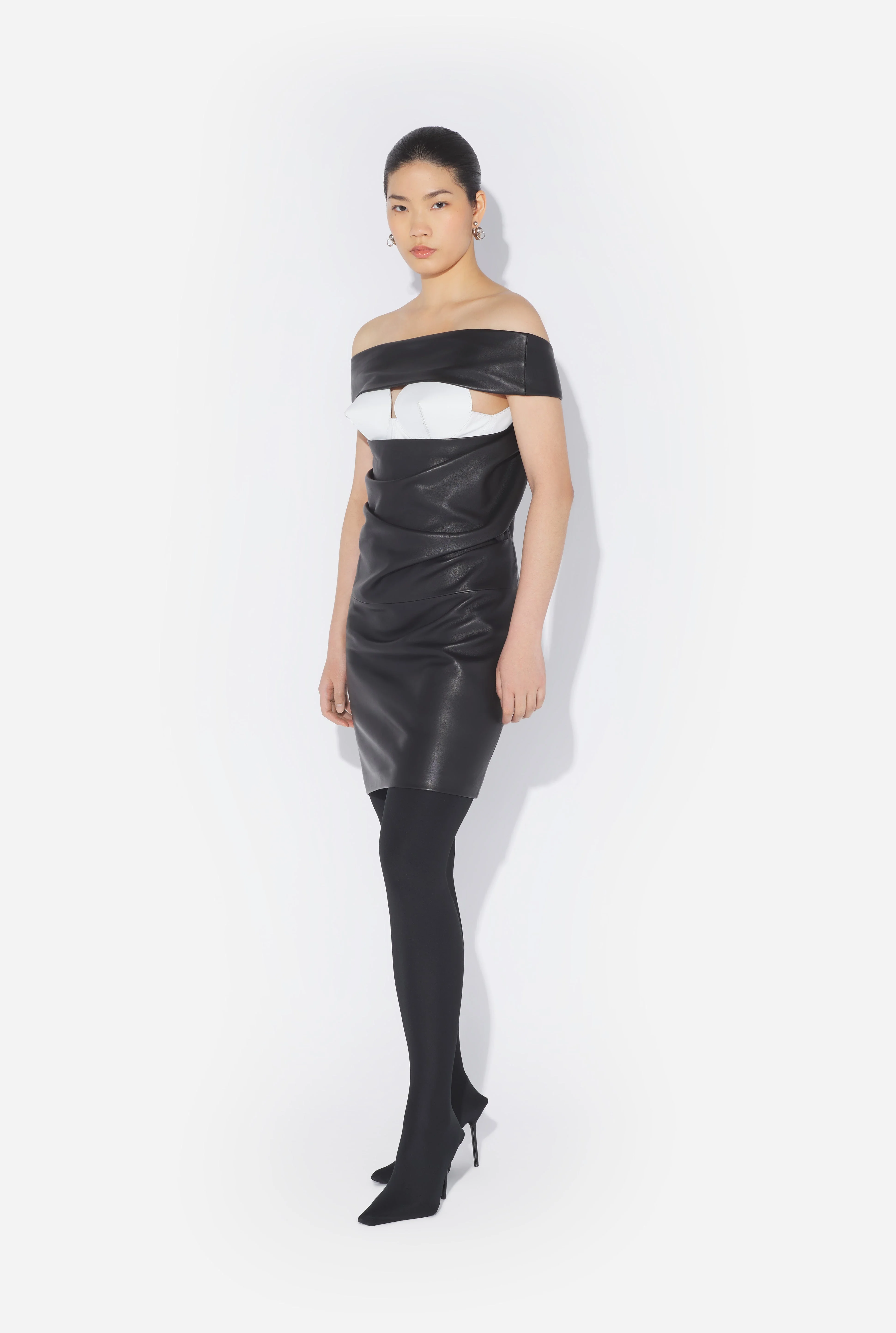 Black leather dress with draped detail and built-in white corset with conical bra cups. PRODUCT DETAILS - Tight fit - Zip fastening on back - Built-in corset with hook fastening - Main material: 100% lambskin - Secondary material: 100% Nappa leather - Lining: 100% cotton - Made in Turkey - Reference: 25/34-F-RO411-L031-0001