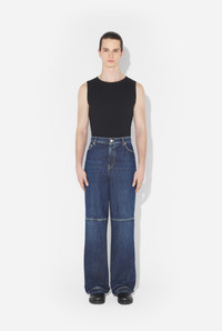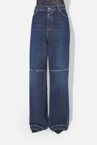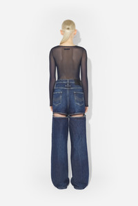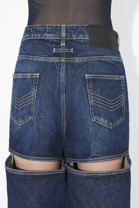 Blue denim jeans with horizontal cut-outs and black leather Gaultier label on the back. PRODUCT DETAILS - Wide fit - Mid-rise waist - Five pockets - Two horizontal cut-outs in backs of legs - Engraved Jean Paul Gaultier button - Engraved Jean Paul Gaultier rivets - Material: 100% cotton - Made in Italy - 25/04-U-TR029-D024-83