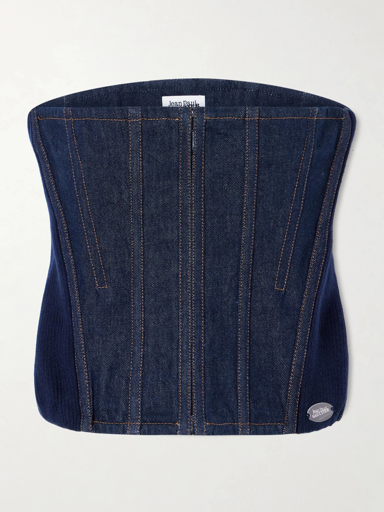 This corset top evokes the '00s in the chicest way, and is distinctively Jean Paul Gaultier in design. It's cut from denim overlayered with contrast topstitching and has ribbed panels of wool. Note the logo-engraved plaque at one side.