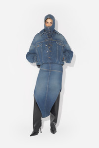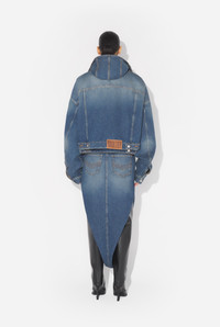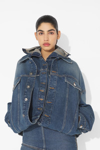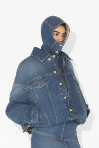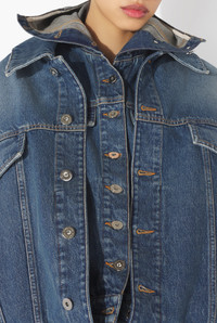 Blue denim jacket with layering detail, built-in hood and Jean Paul Gaultier label in back. PRODUCT DETAILS - Oversized fit - Four pockets in outer jacket - Four pockets in inner jacket - Leather Jean Paul Gaultier label in back - Button fastening - Engraved Jean Paul Gaultier buttons - Material: 100% cotton - Made in Italy - Reference : 25/03-U-JA006-D024-57