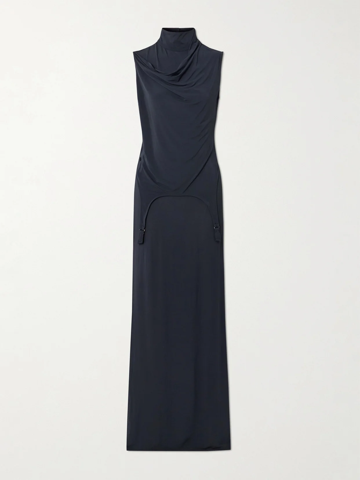 Jean Paul Gaultier's turtleneck dress is subtly subversive. It's cut from stretch-jersey with a draped neckline and detailed with garter straps below the waist. Wear yours with point-toe pumps.