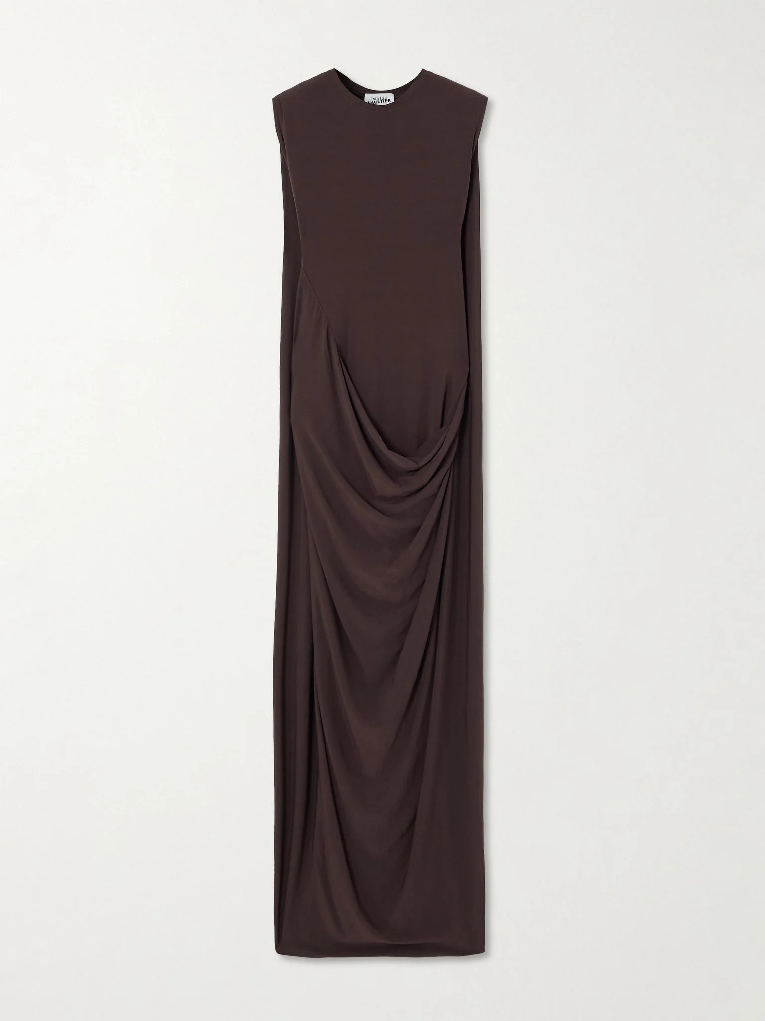 The simple shape of Jean Paul Gaultier's maxi dress is transformed by artful draping through the waist. It's made from smooth stretch-satin for a close fit and has a high neckline. Wear yours with point-toe pumps. Size & Fit - Fits true to size, take your normal size - Designed to be slightly fitted at the bust and waist, loose at the hip - Mid-weight, stretchy fabric - Model is 177cm/ 5'10" and is wearing a size Small Model measurements: - Bust: 85cm/ 33.5" - Waist: 65cm/ 25.5" - Hip: 91cm/ 36 Details & Care - Brown stretch-satin - Concealed hook and zip fastening at back - 94% rayon, 6% elastane - Dry clean