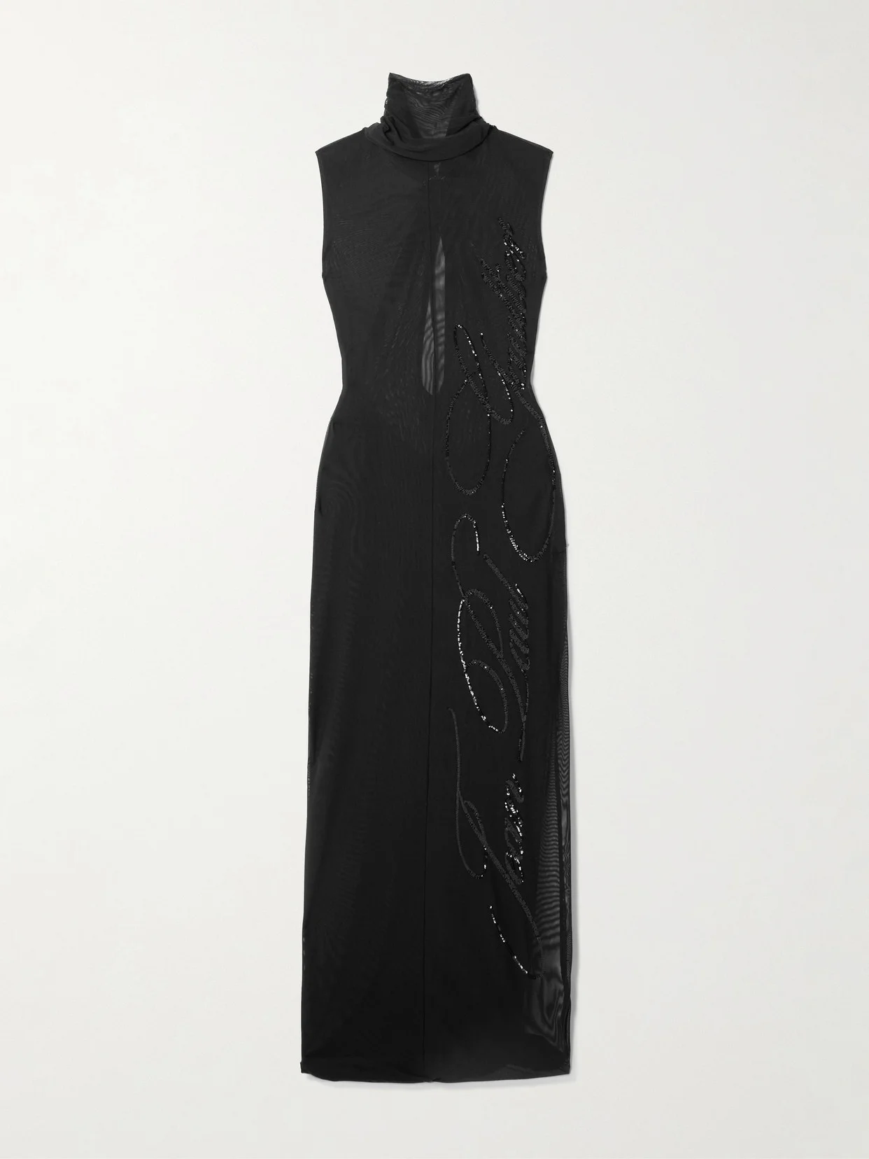 Jean Paul Gaultier's name glistens down the front of this dress, sequined in beautiful cursive. It's made from slinky tulle and gathered at the nape of the neck - a piercing-inspired ring holding its shape - so match jewelry to its silver tone.