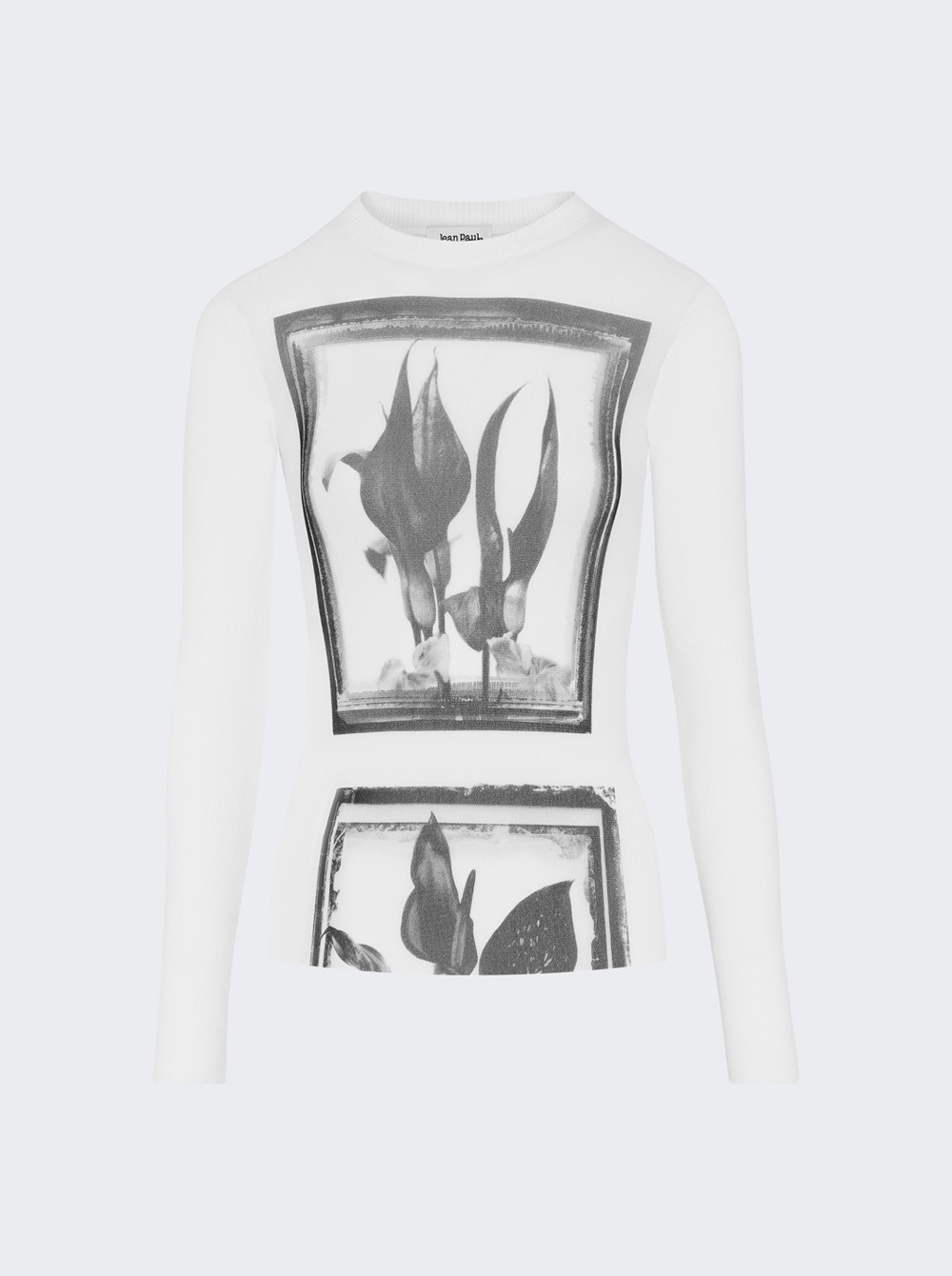 Details - Mesh long sleeve top - Knitted sleeves - Fitted design - Placed "Flowers Cadres" print - Model is 5'9"/175cm and is wearing a size S - 100% Polyamide Brand Style: 25/33-F-TO259-T579-010200 Designer/Brand: JEAN PAUL GAULTIER