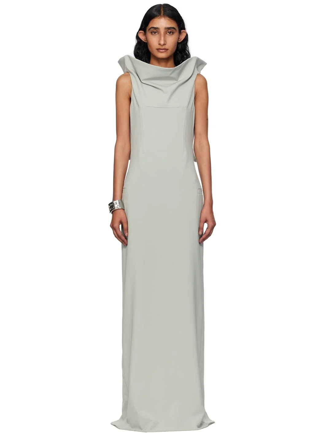 Stretch nylon twill maxi dress. · Funnel neck · Darts at chest · Welt pocket at side seams · Extended trim with underwire at open back · Post-stud strap and cutout at back · Zip closure at back · Central vent at back hem Supplier color: Grey 94% polyamide, 6% elastane. Made in France 252808F055005