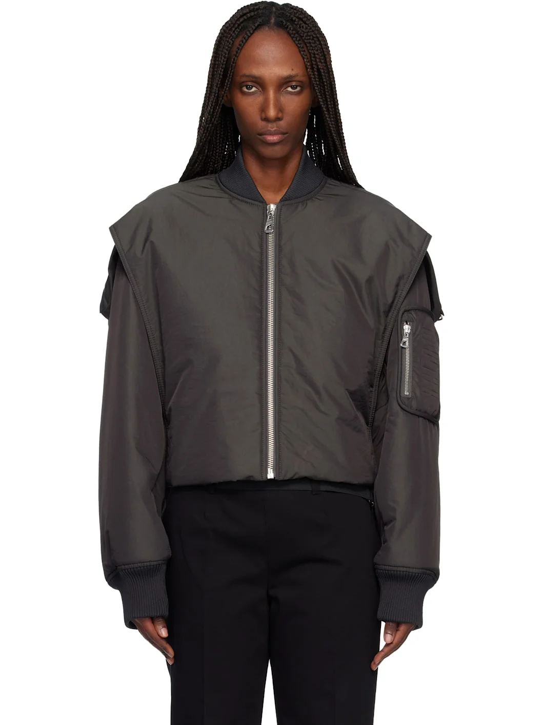 Padded nylon-blend taffeta bomber jacket. · Paneled construction · Stowaway hood · Rib-knit stand collar and cuffs · Zip closure · Welt pockets at front · Elasticized hem · Logo-embossed zip pocket at sleeve · Locker loop at back collar · Welt pocket at interior · Full taffeta lining Supplier color: Dark grey Body: 52% nylon, 48% polyester. Fill: 100% polyester. Lining: 100% polyester. Made in Italy 252808F058001