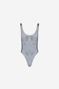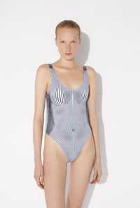 Black and white one-piece swimsuit with striped body print. PRODUCT DETAILS - Open back - Main materials: 83% polyester, 17% elastane - Panty lining: 90% polyamide, 10% elastane - Made in Portugal - Reference: 25/33-F-MB022-J571-0100
