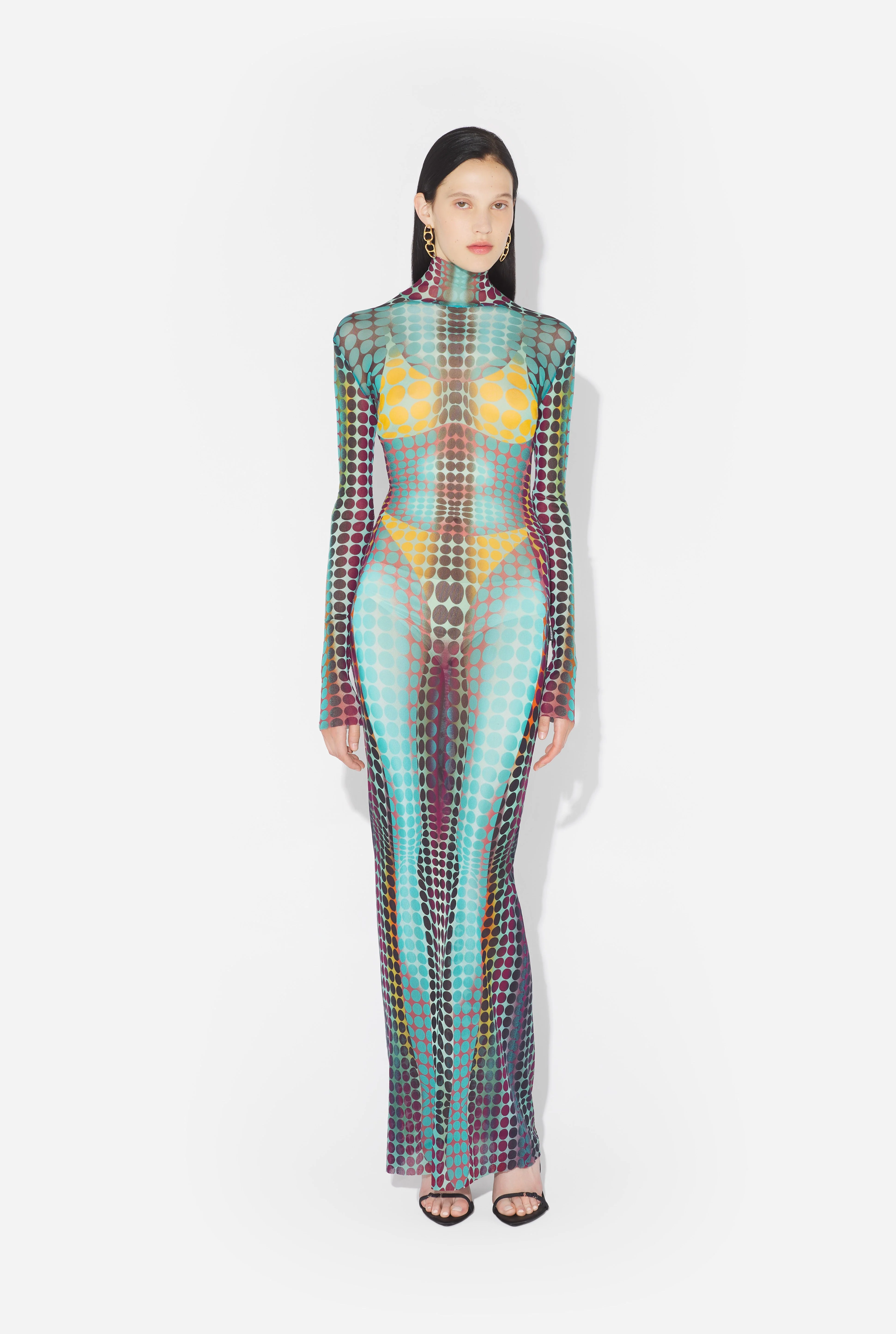 Long Dress with a dots print. PRODUCT DETAILS - Stretch fit - High neck - Long sleeves - Materials : 80% Polyamide, 20% Elastane - Made in Italy - Ref: 26/01-W-DR131-M018P-502710 - Reference : 26/01-W-DR131-M018P-502710