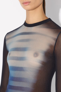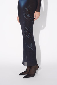 Long blue tulle dress with crew neck and “Le Male” print. PRODUCT DETAILS - Tight fit - Crew neck - Stretchy material - Long sleeves - Material: 100% polyamide - Made in Italy - Reference: 25/33-F-RO366-T576-595601