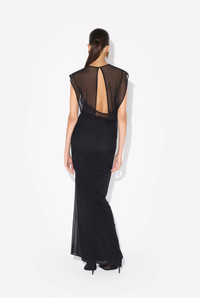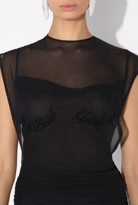 Long draped black tulle dress with flocked Jean Paul Gaultier logo detail. PRODUCT DETAILS - Semi-slim fit - Crew neck - Teardrop button fastening - Built-in slip - Materials: 94% polyamide, 6% elastane - Made in Portugal - Reference: 25/33-F-RO370I-T005-00
