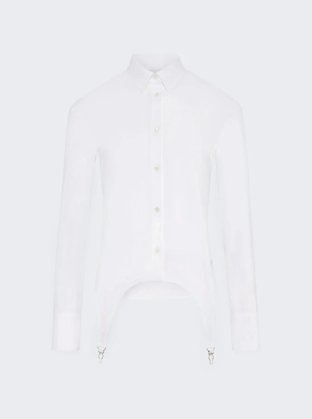 Details - Button-down cotton poplin shirt - Back vent detail with button closure - Garter strap detail at the front hem - Material: 97% Cotton, 3% Elastane Vendor Color Code: Brand Style: 25/04-W-ST037-C071-01 Designer/Brand: JEAN PAUL GAULTIER