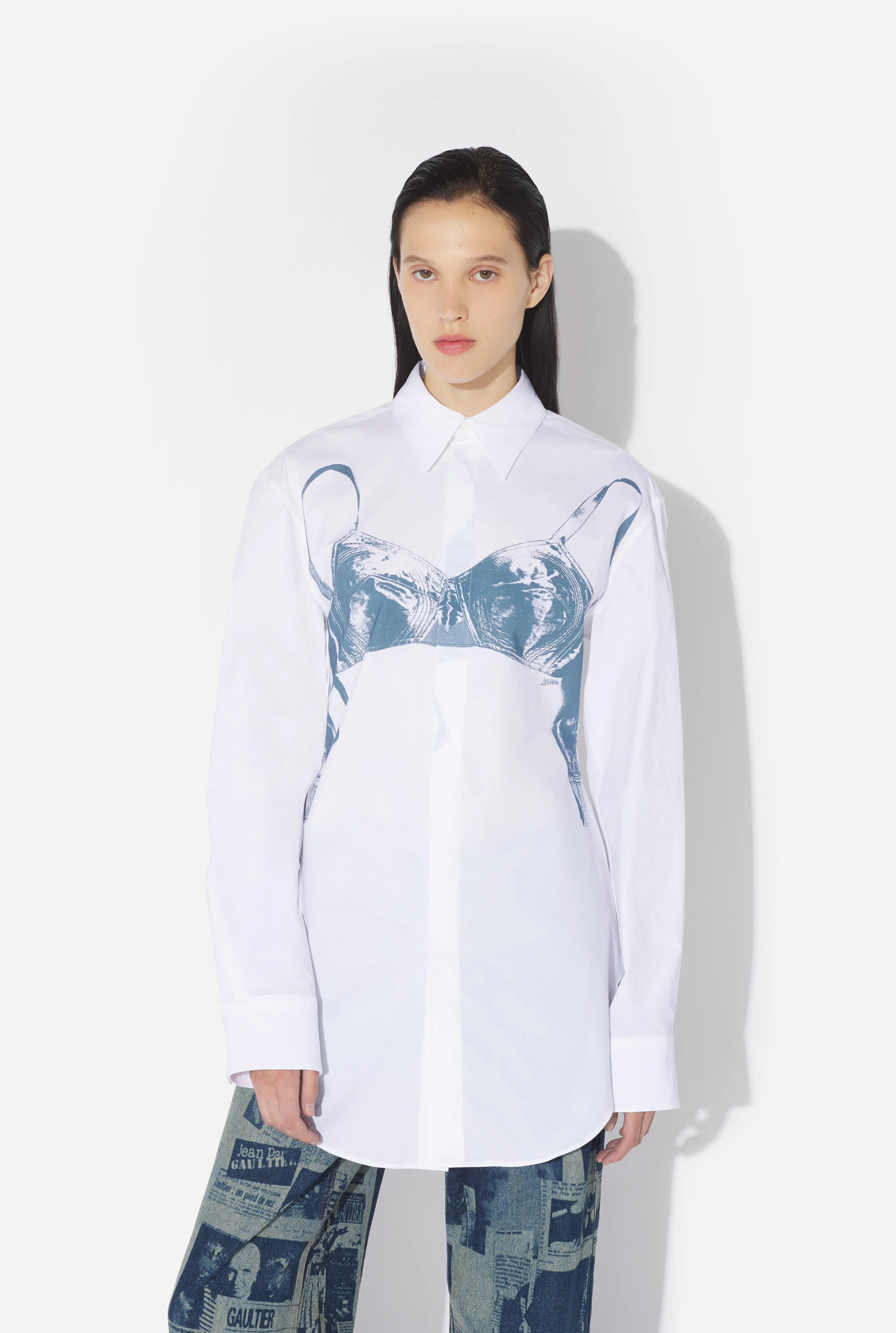 White cotton shirt with blue scanned-effect bra print. PRODUCT DETAILS - Straight fit - Mother-of-pearl button fastening - Mother-of-pearl cuff buttons - Material : 97% cotton, 3% elastane - Made in Morocco - Reference : 26/01-W-ST053-C071-01102