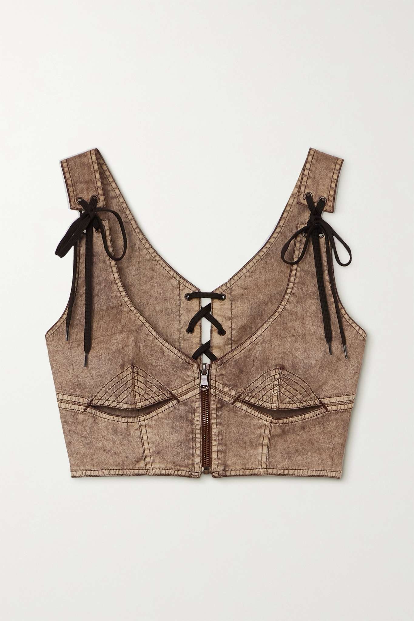 EDITORS'NOTES Jean Paul Gaultier and KNWLS are both known for their corset-inspired silhouettes, which is why their latest collaboration is so exciting. This bustier top is made from stretch-cotton with lace-up ties and cutout cups. The coolest way to wear it is with slouchy jeans. SIZE & FIT - Fits true to size, take your normal size - Intended for a close fit - Ties at the back for an adjustable fit - Mid-weight, non-stretchy fabric - Model is 175cm/ 5'9" and is wearing a FR 36 DETAILS & CARE - Mélange brown stretch-cotton, tan leather - Zip fastening through front, ties at back - 97% cotton, 3% elastane