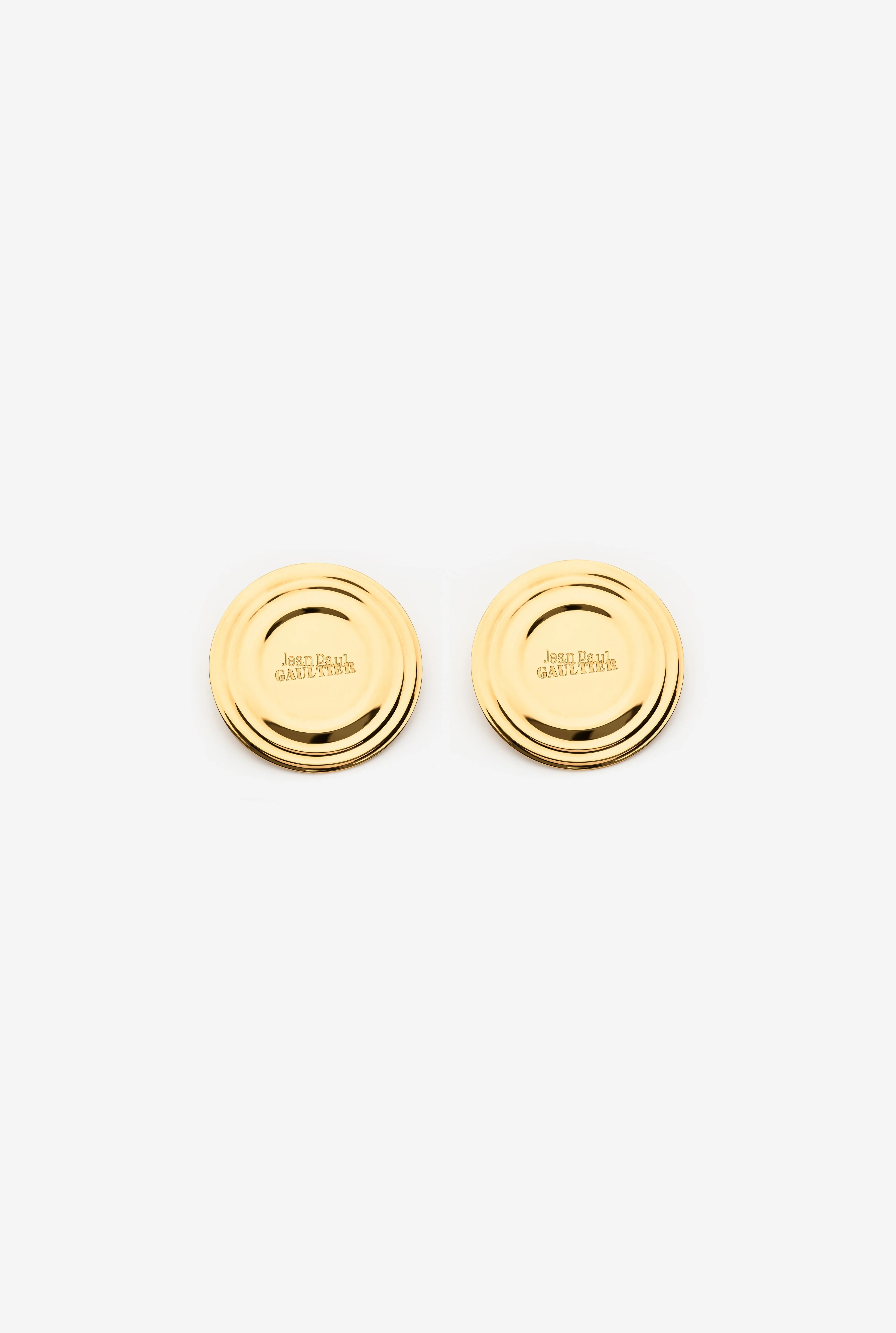 Gold-toned brass earrings in the shape of engraved Jean Paul Gaultier can lids. PRODUCT DETAILS - Sold as a pair - Push clasp - Material: 100% brass - Made in Italy - 25/04-W-JW032-X053-92