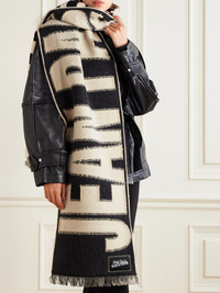 Jean Paul Gaultier's scarf is intarsia-knitted with the label's logo in bold, oversized lettering, so it will bring a graphic edge to any outfit. It's made from soft wool and has an enveloping shape with wispy frayed ends. Details & Care - Charcoal and cream wool - 100% wool - Dry clean