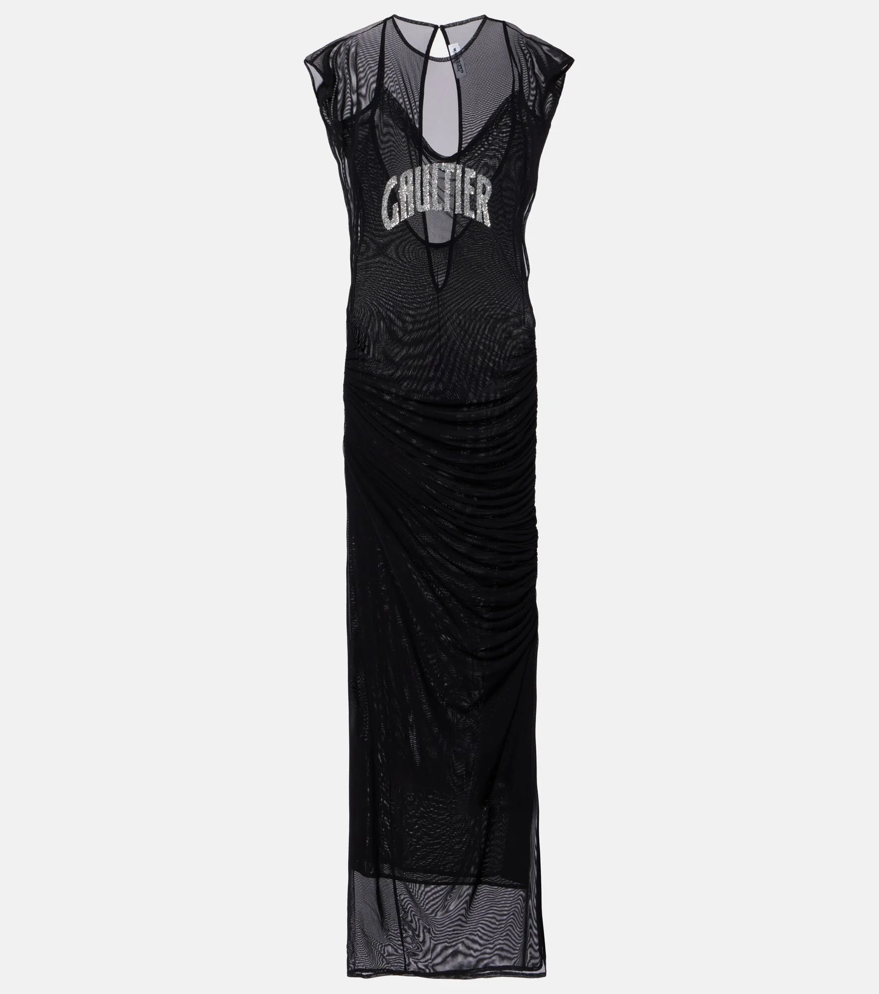 This layered maxi dress by Jean Paul Gaultier is crafted from sheer mesh for a seductive evening look. The two-piece silhouette is finished with a sequined signature detail at the front and a daring cutout accent. Product Details - Material: 94% polyamide, 6% elastane - Care instructions: machine wash at 30 degrees - Made in Portugal - Designer color name: Black/Silver - Item color: black, silver - Two-piece set - Item number: P01110224 Size & Fit - True to size - Low back - Semi-sheer - Fitted - Slightly stretchy fabric - The model seen in the picture is 178cm-5'10" and wearing a size XS