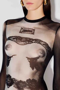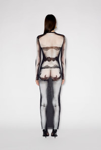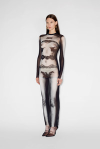 Gaultier TV Collection Long black tulle dress with nude body trompe l’œil print and Jean Paul Gaultier logo detail. PRODUCT DETAILS - Tight fit - Crew neck - Stretchy material - Long sleeves - Material: 100% polyamide - Made in Italy