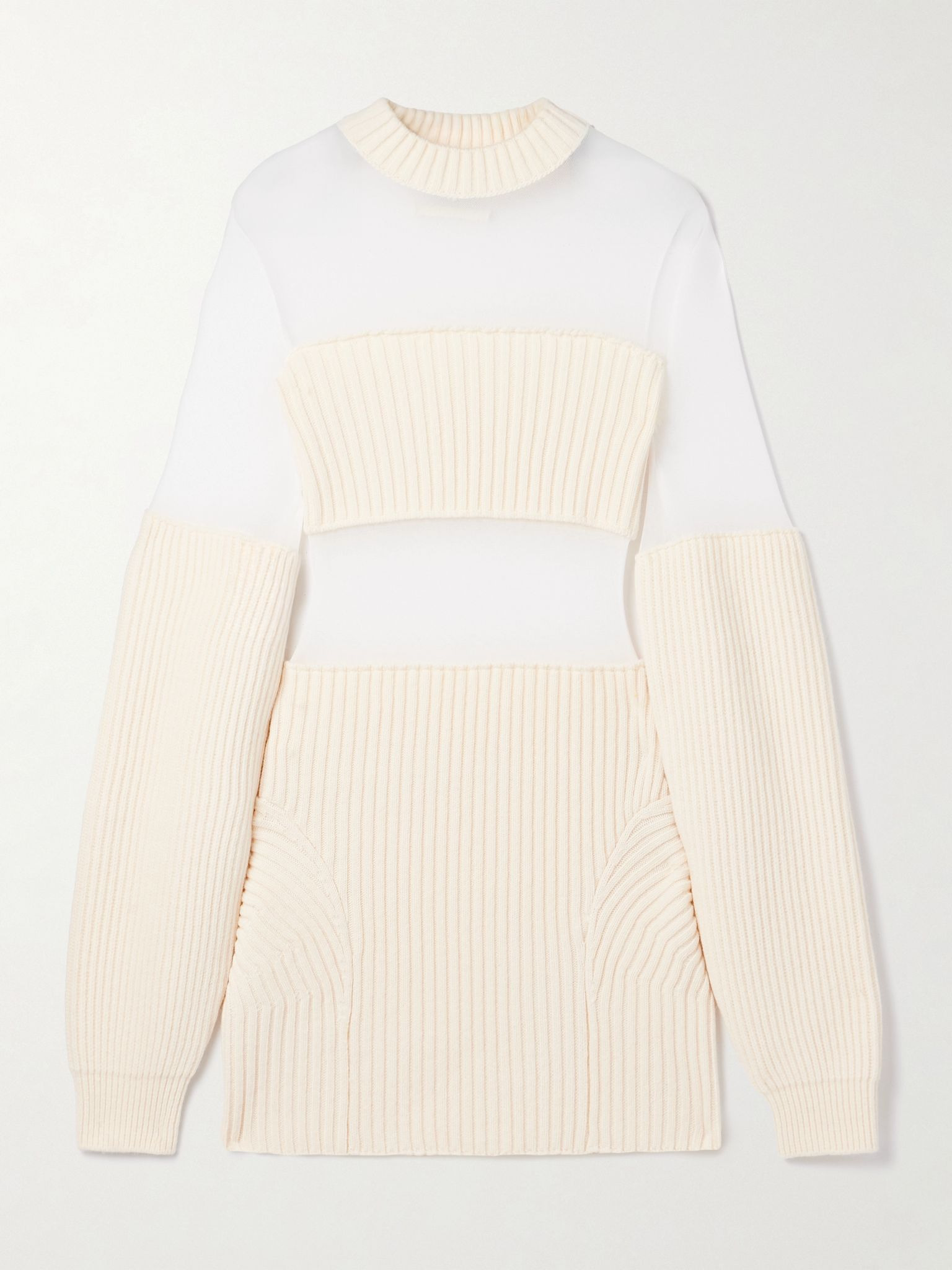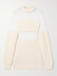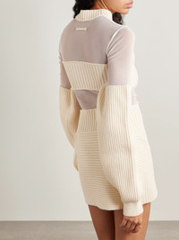 Jean Paul Gaultier's mini dress has panels of mesh along the yoke, sleeves and waist that create the illusion of cutouts. It's knitted from ribbed wool that's curved along the hips to highlight your figure. Size & Fit - Fits true to size, take your normal size - Intended for a close fit - Lightweight knit - Model is 175cm/ 5'9" and is wearing a size Small Details & Care - Cream wool, white mesh - Slips on - Fabric1: 100% wool; fabric2: 100% polyamide - Dry clean