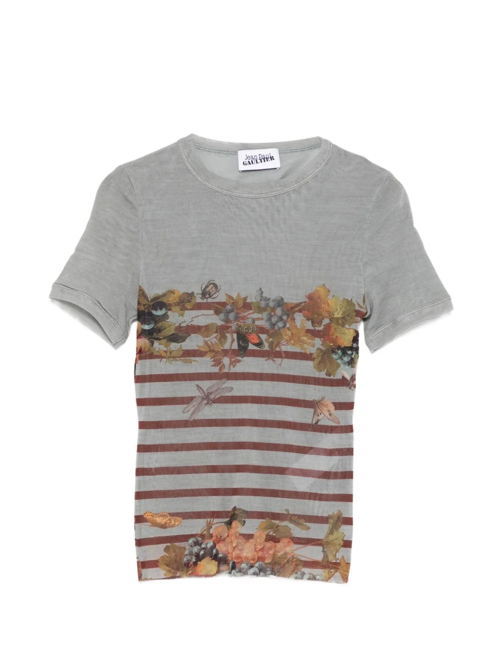 striped floral T-shirt Highlights - Light grey - Striped - Floral print - Round neck - Short sleeves - Sheer finish Imported Composition Polyamide 100% Washing instructions Read Manufacturer Guidelines
