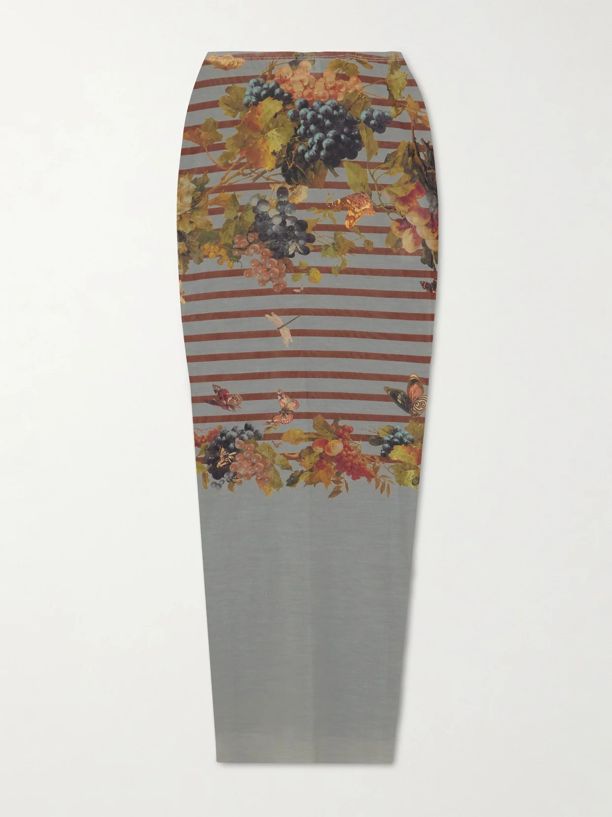 Nautical stripes are a Jean Paul Gaultier signature. This skirt is made from mesh patterned with the motif, alongside vines of grapes and butterflies. Style yours with the matching tee and strappy sandals.