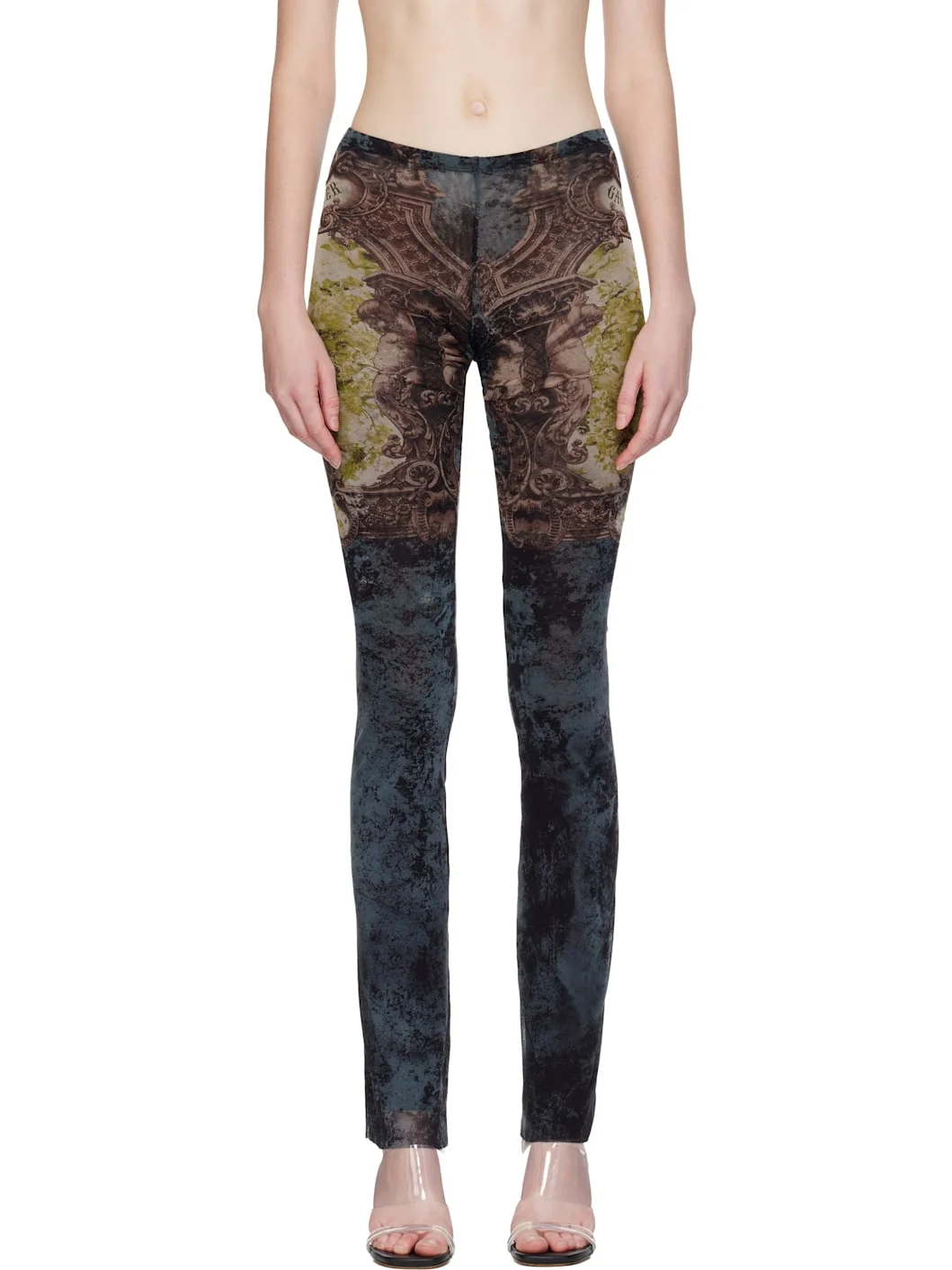 Semi-sheer nylon tulle lounge pants. · Skinny-fit · Graphic pattern printed throughout · Elasticized waistband · Raw edge at cuffs · Logo printed at outseams · Locker loop at back waistband Supplier color: Black/Vintage 100% polyamide. Made in Italy 252808F086013
