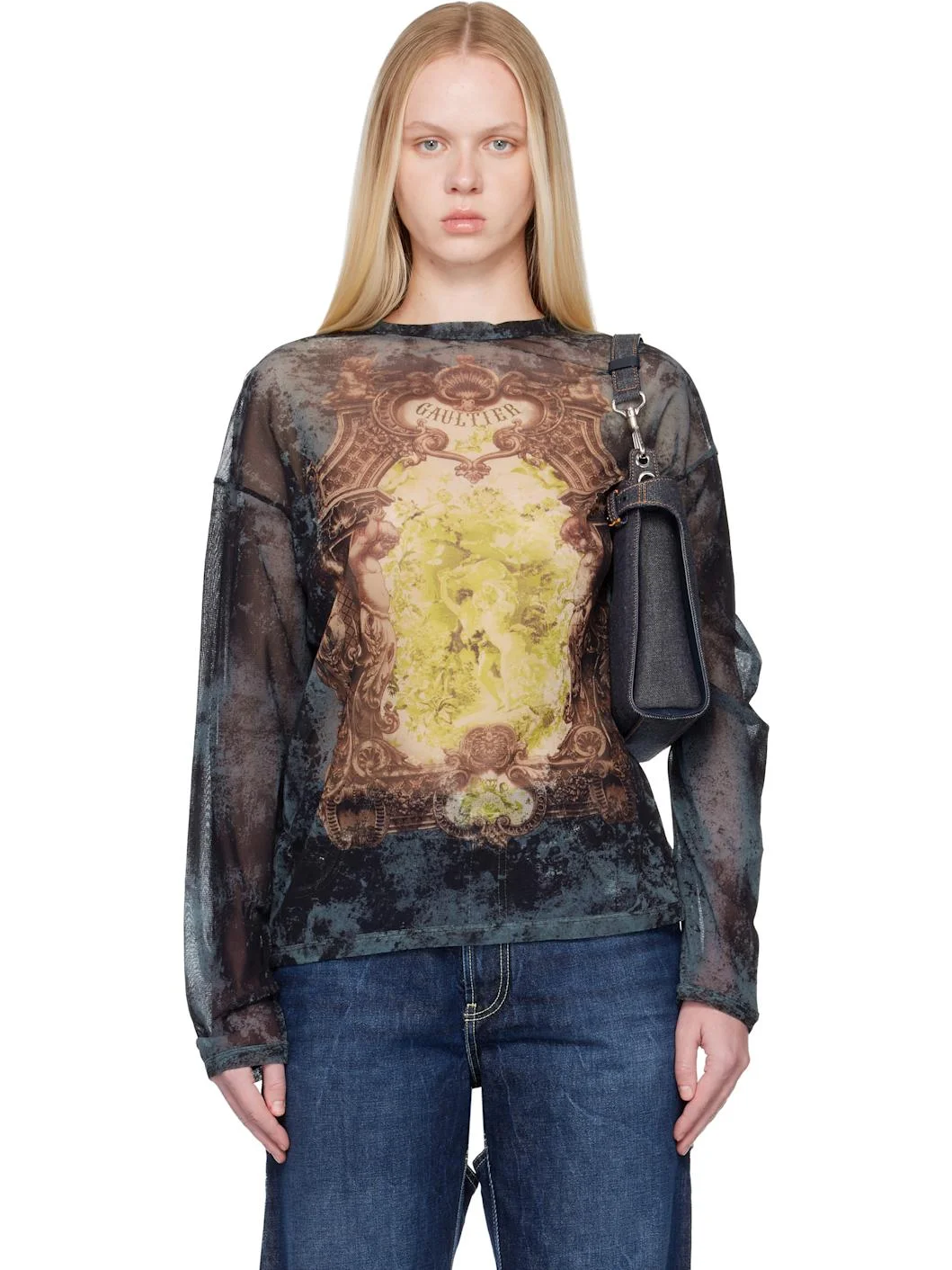 Semi-sheer nylon tulle T-shirt. · Graphic pattern printed throughout · Crewneck · Logo printed at chest and back · Dropped shoulders · Locker loop at back collar Supplier color: Black/Vintage 100% polyamide. Made in Italy 252808F110021