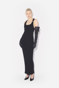 Long black ribbed cotton dress with engraved Jean Paul Gaultier piercing ring detail. PRODUCT DETAILS - Tight fit - Removable piercing ring with Jean Paul Gaultier engraving on left shoulder - Material: 100% cotton - Made in Bulgaria - Reference : 25/03-W-DR067-J014-00