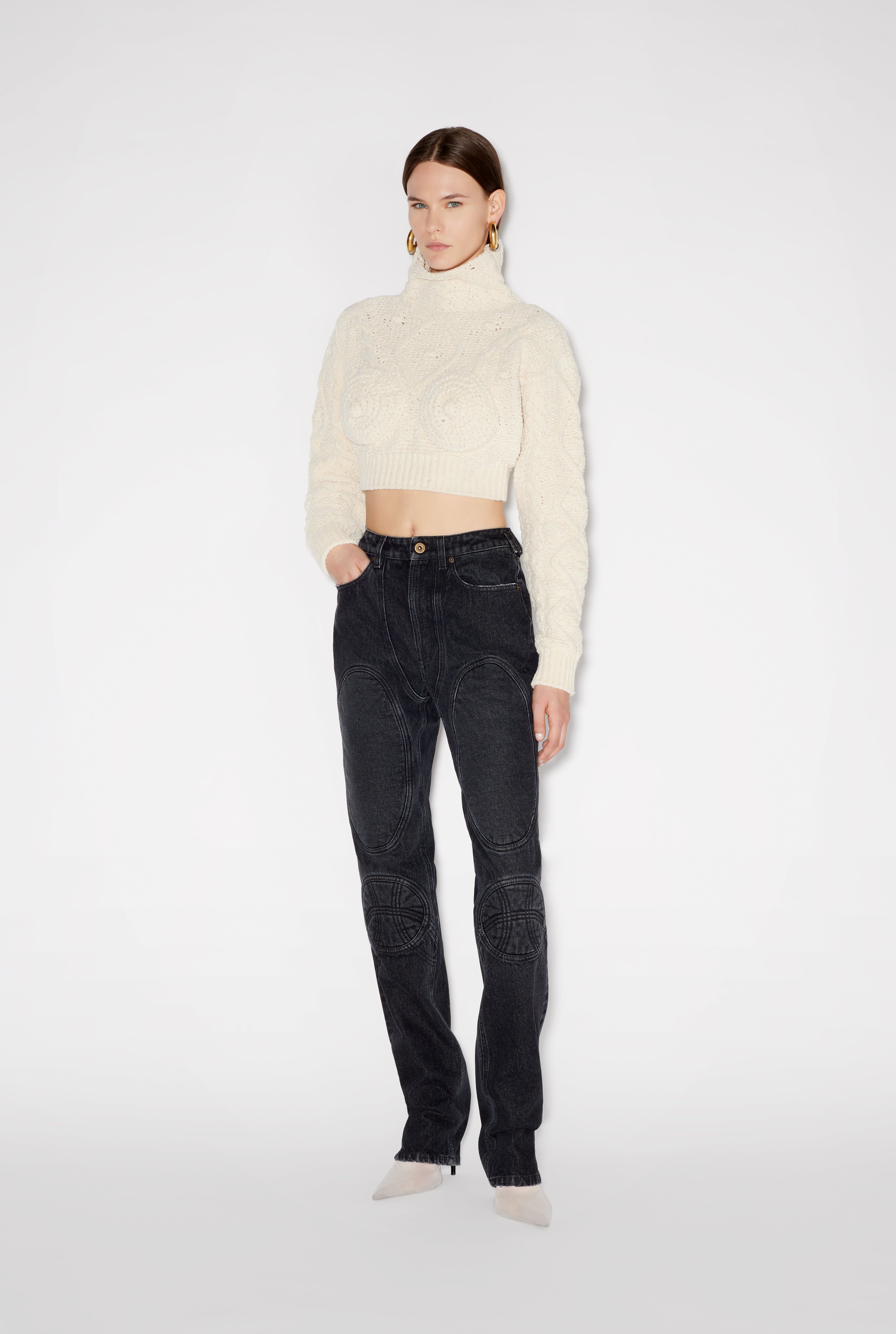 Gaultier TV Collection Black denim jeans with tone-on-tone lace-up in back and a leather Haute Jeanerie label. PRODUCT DETAILS - Straight fit - Five pockets - Belt loops - Adjustable waistband in back - Engraved Jean Paul Gaultier metallic button fastening - Ankle zip fastenings - Material: 100% cotton - Made in Italy