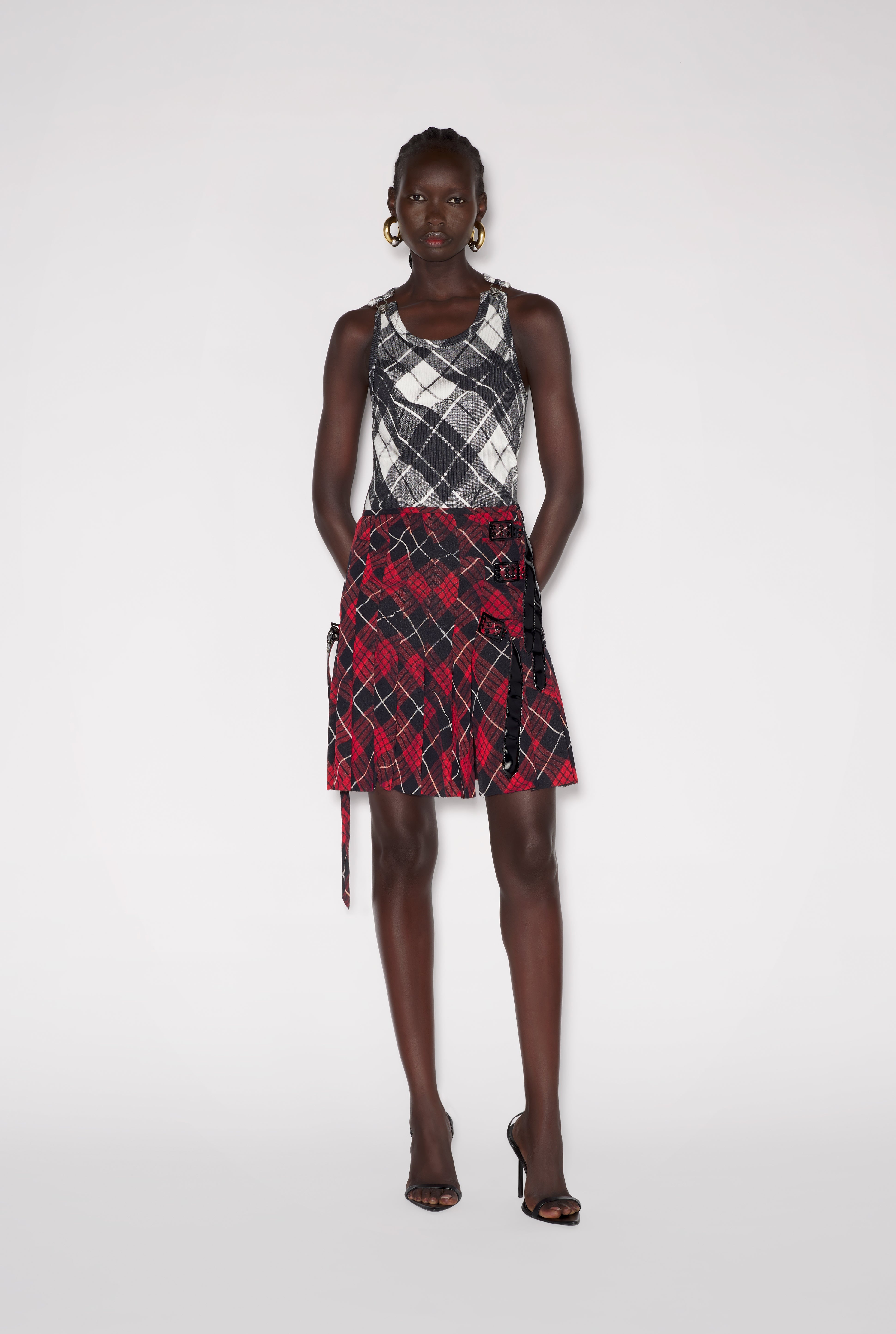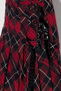Gaultier TV Collection Red pleated tulle kilt with Tartan print. PRODUCT DETAILS - Pleated tulle - Three straps with black metal buckles on side - Invisible zip on side - Material: 100% polyamide - Made in Italy